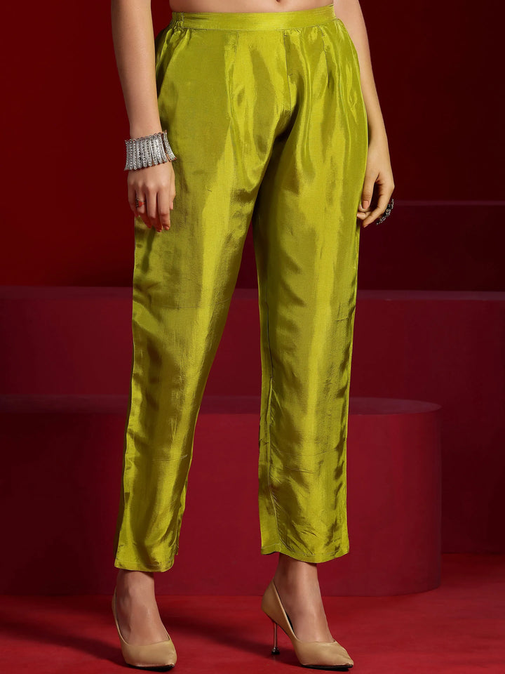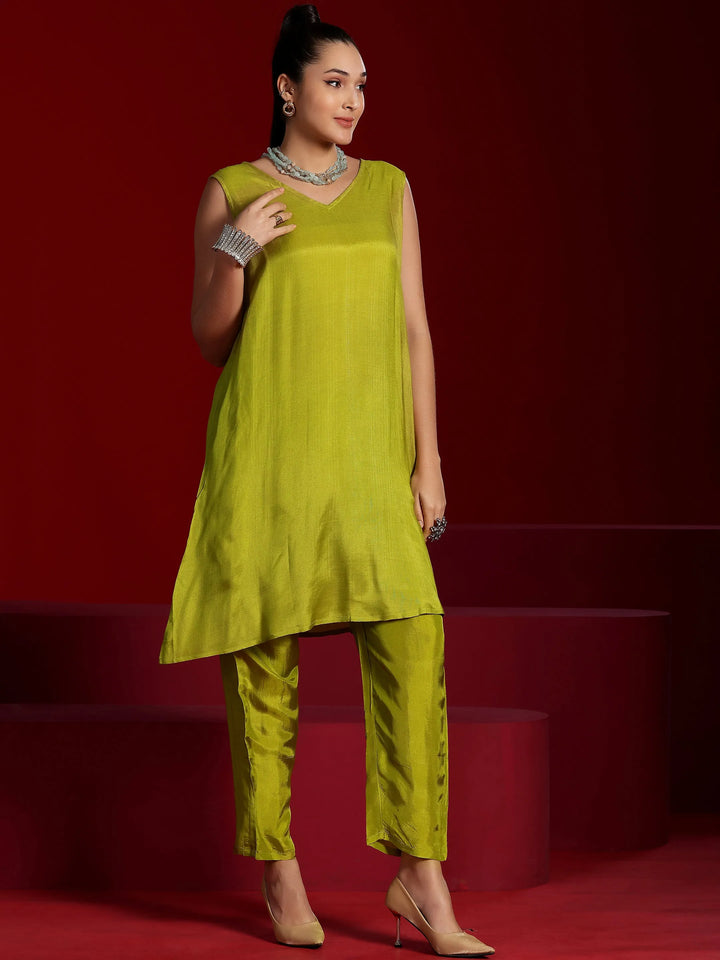 Our 2-piece Green printed Poly Georgette co-ord set features a Straight-fit Tunic with a V-Neck neckline and Three-quarter sleeves. Complemented with matching Palazzos, Trousers with an Elasticated waistband. Highlighted with Printed, this style is perfect for Festive.