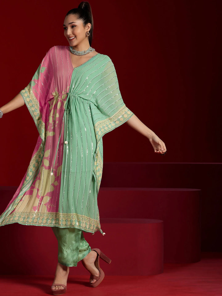 Our 2-piece Pink and Green printed Poly Georgette co-ord set features an Asymmetric Hemline Tunic with a V-Neck neckline and Three-quarter sleeves. Complemented with matching Palazzos with an Elasticated waistband. Highlighted with Printed, this style is perfect for Festive occasions.