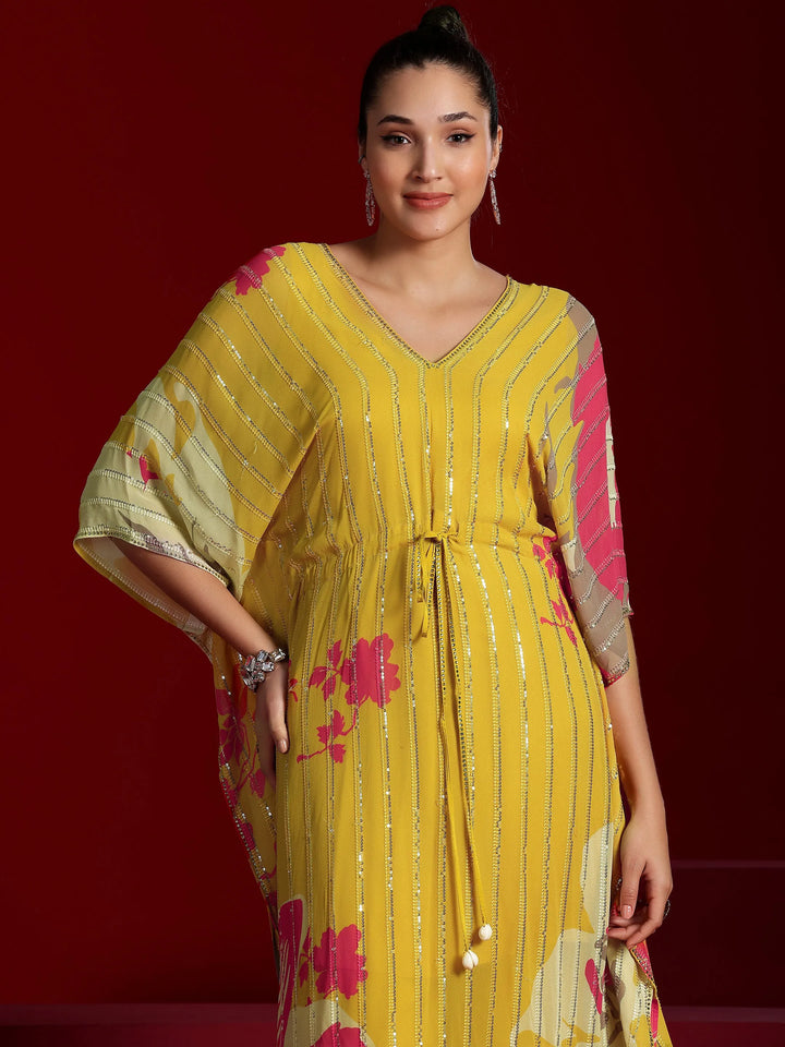 Our 2-piece Yellow printed Poly Georgette co-ord set features a Straight-fit Tunic with a V-Neck neckline and Three-quarter sleeves. Complemented with matching Palazzos with an Elasticated waistband. Highlighted with Printed, this style is perfect for Festive.
