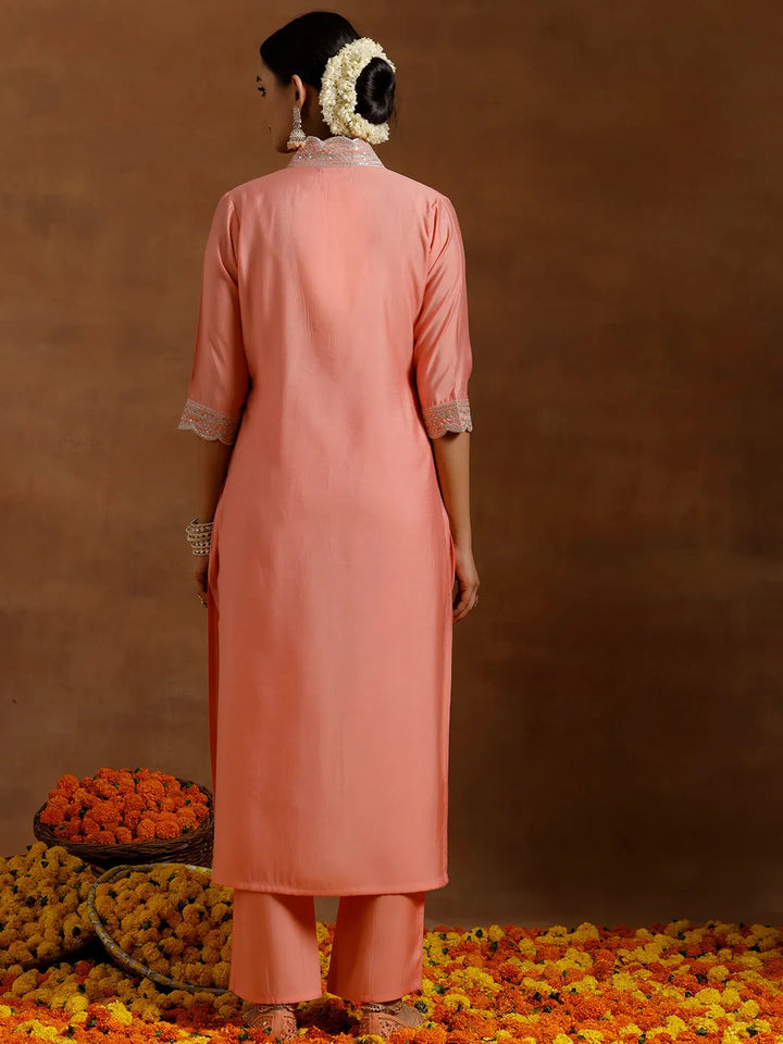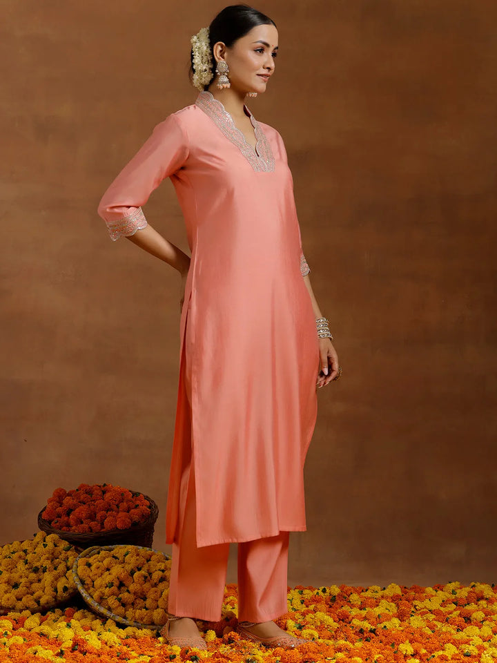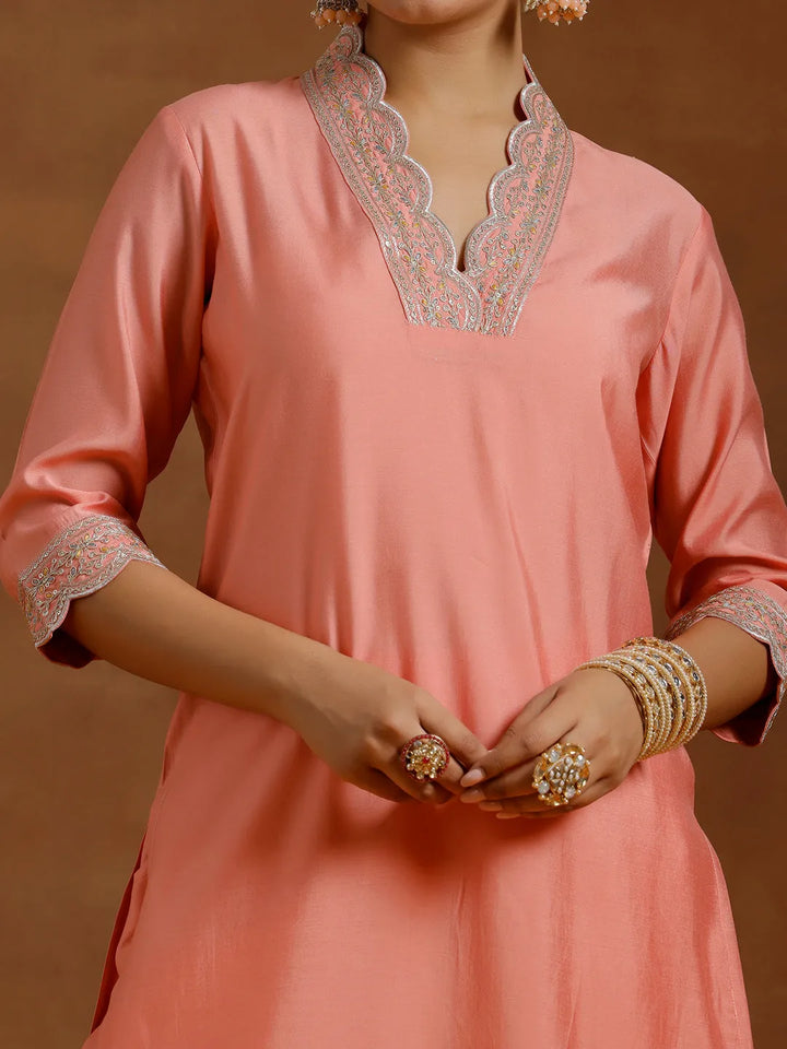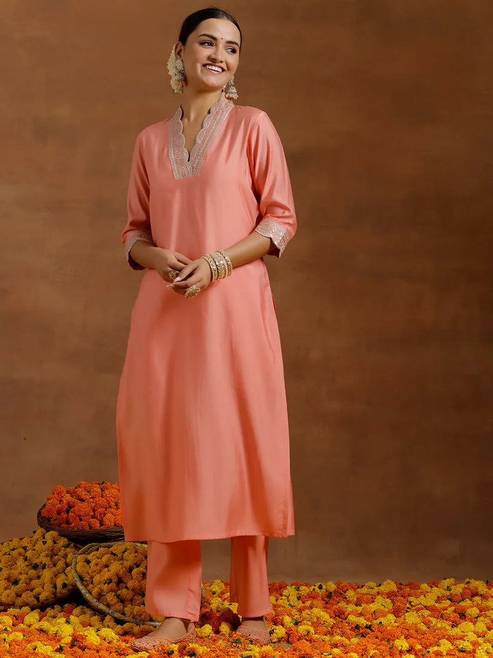 Our 2-piece peach silk blend features a straight-fit kurta with a V-neckline, regular sleeves, and a statement yoke. Complemented with straight pants with an elasticated waistband. Adorned with embroidered accents, this style is perfect for festive occasions.