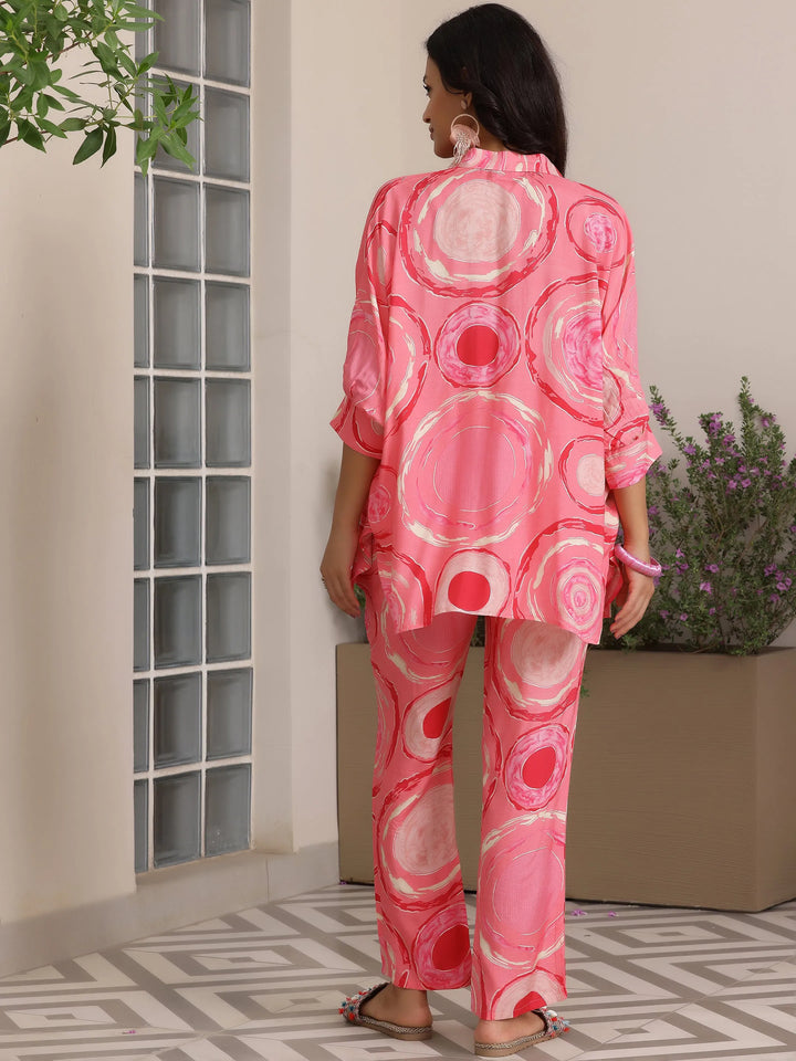 Our 2-piece pink printed silk blend co-ord set features an asymmetrical kurti with a shirt collar with buttoned-down detailing and three-quarter bishop sleeves. Complemented with matching trousers with a partially elasticated waistband and roomy pockets. Adorned with abstract geometric prints and stylish buttons, this style is perfect for casual outings.