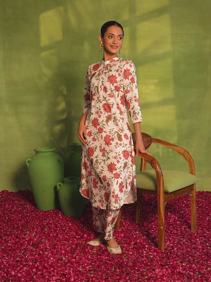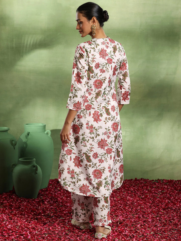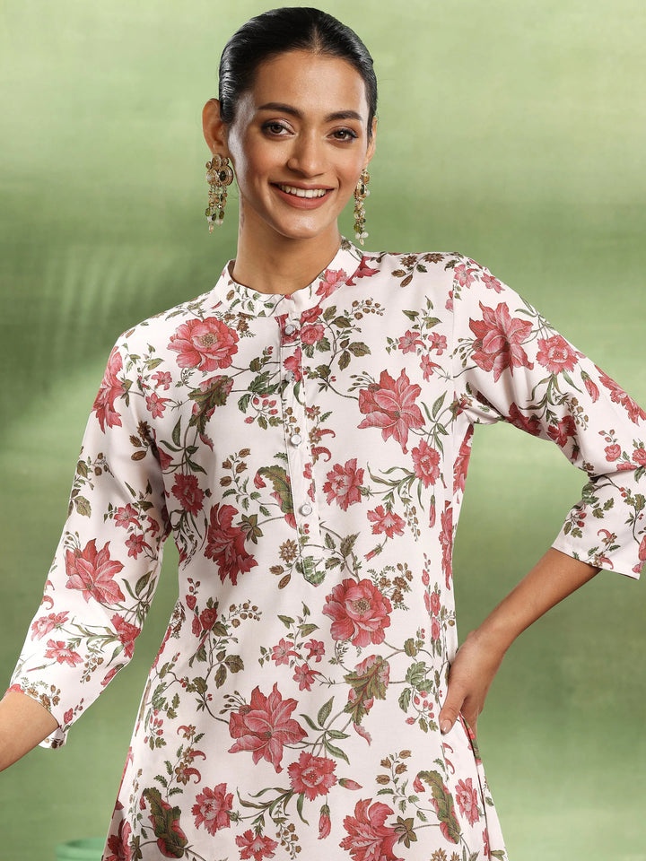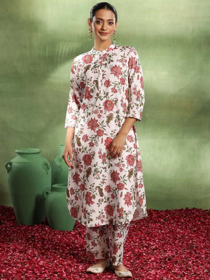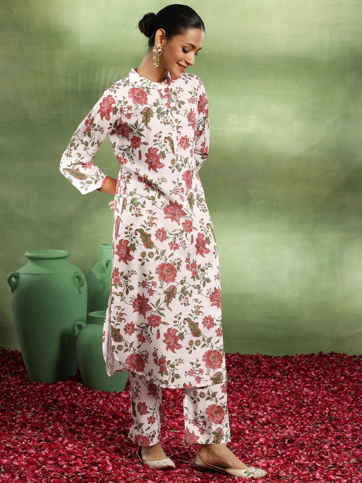 Our 2-piece white printed rayon co-ord set features a mandarin collar and three-quarter sleeves. Complemented with trousers with a partially elasticated waistband and roomy pockets. Highlighted with captivating floral prints and stylish button accents, this style is perfect for casual outings.