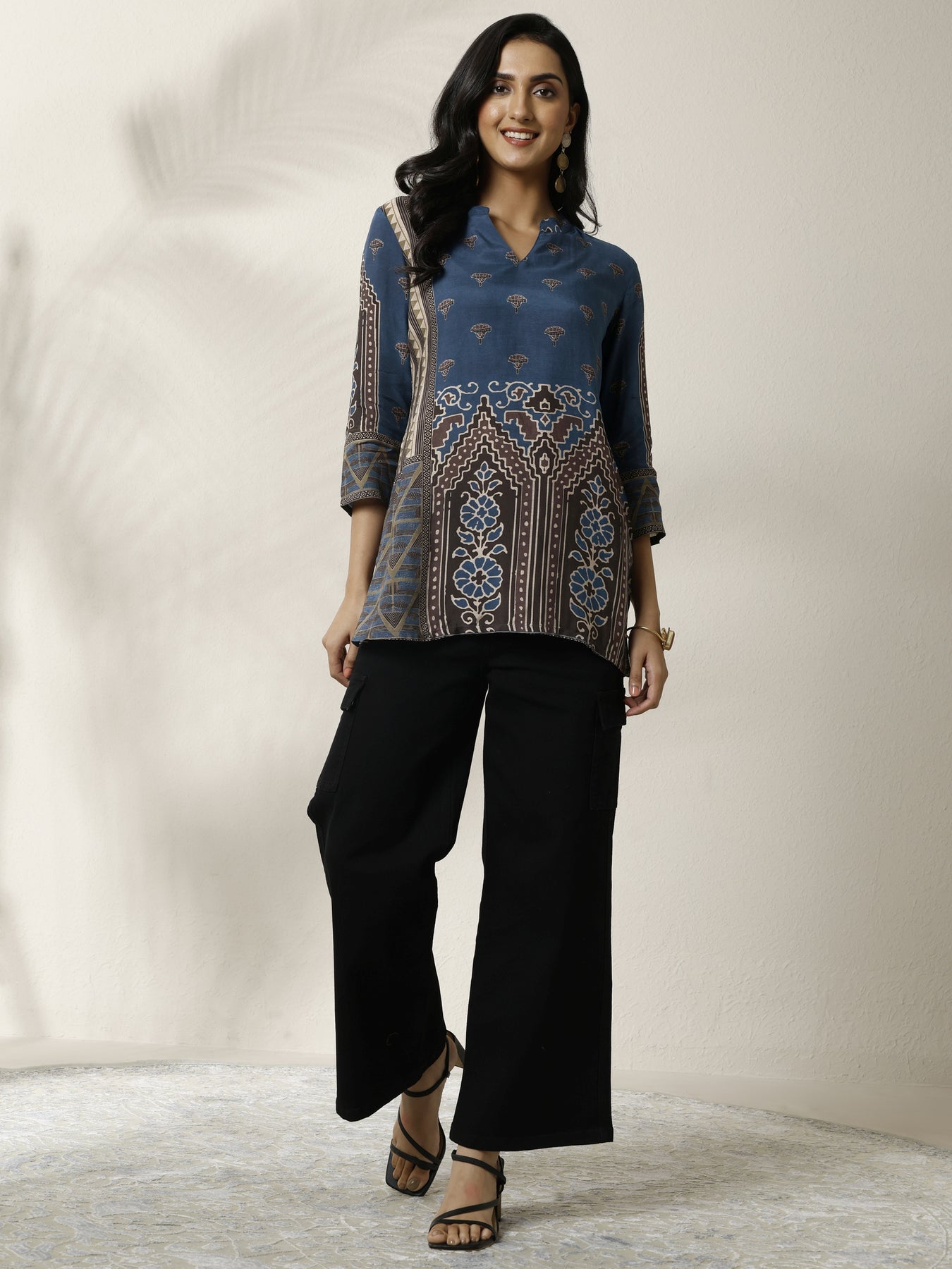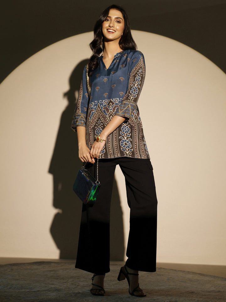 Our 1-piece blue and brown muslin straight-fit kurta features a mandarin collar neckline, roll-up sleeves. Adorned with block printed, this style is perfect for work wear and casual wear.