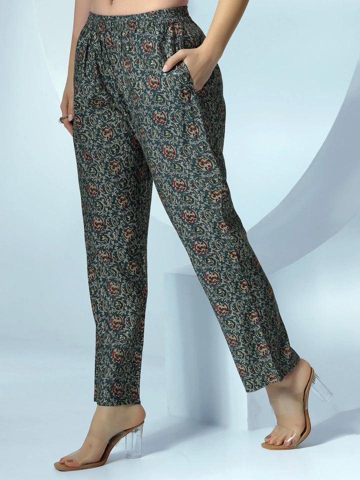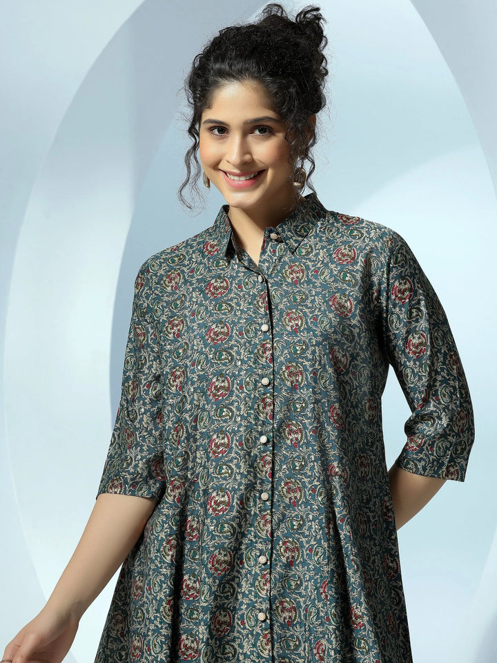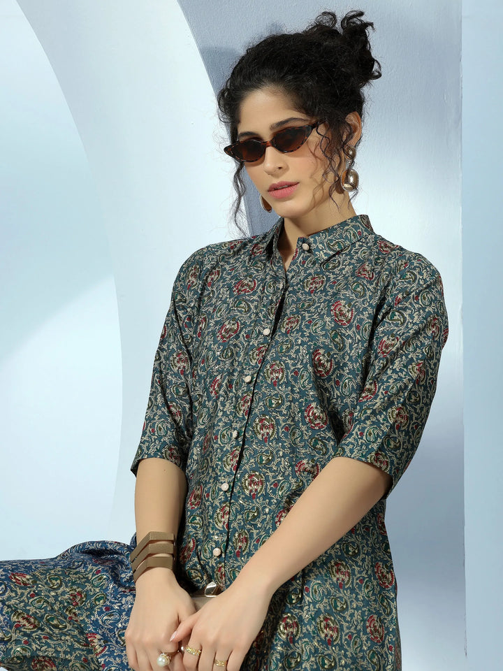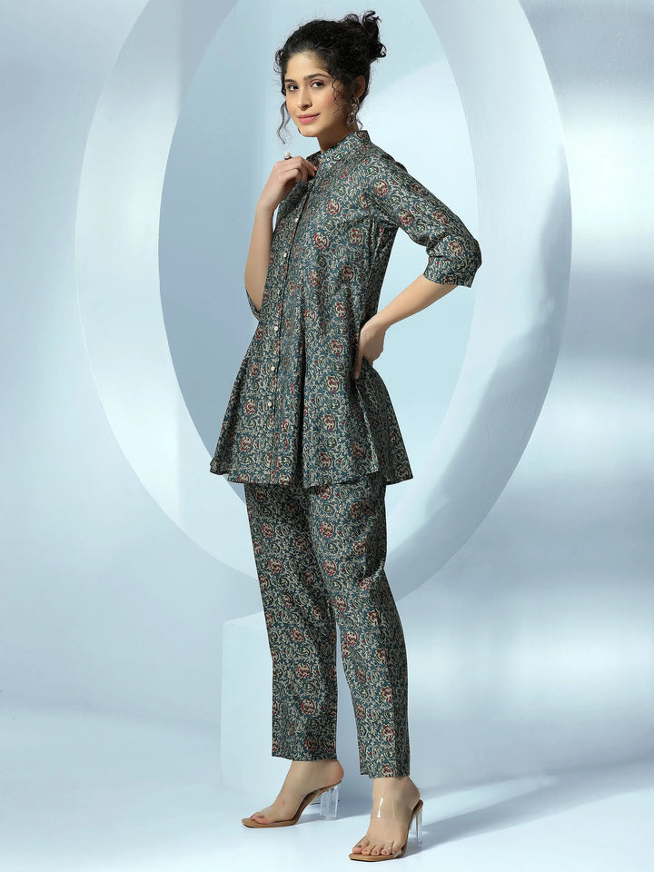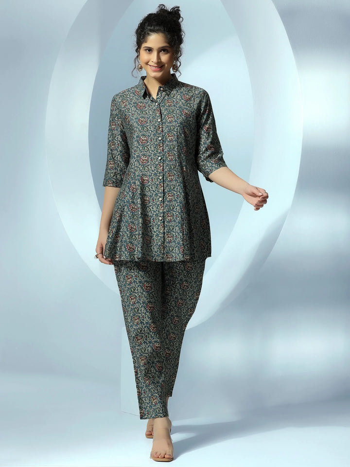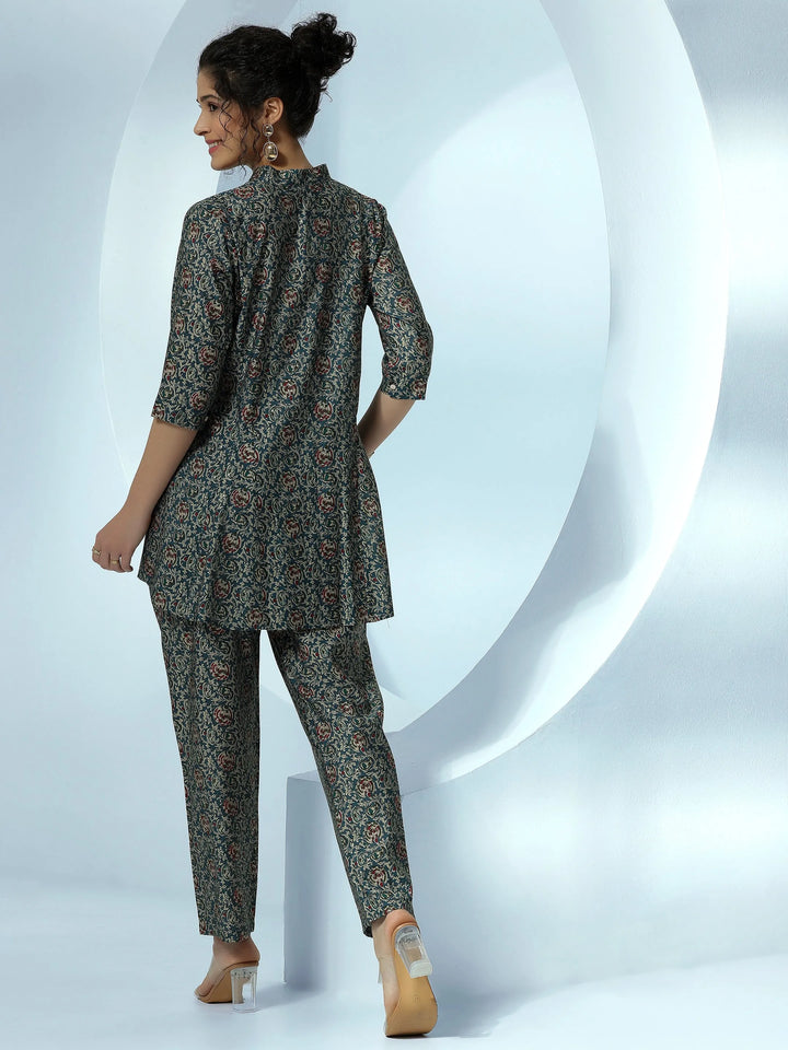 Our 2-piece blue printed silk blend co-ord set features a shirt-style flared tunic with three-quarter sleeves. Complemented with matching trousers with a partially elasticated waistband and roomy pockets. Highlighted with stylish button accents and floral patterns, this style is perfect for casual outings.