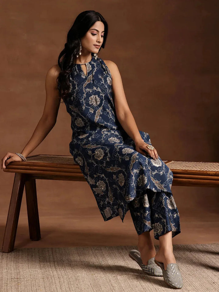 Our 2-piece blue printed silk blend kurta set features a sleeveless straight-fit kurta with a notched neckline. Complemented with trousers with a partially elasticated waistband and roomy pockets. Highlighted with captivating floral prints, this style is perfect for casual outings.