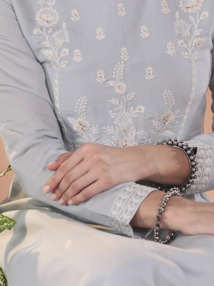 Our 3-piece blue silk blend suit set features a floral embroidered straight-fit kurta with a round neckline, comfortable full sleeves, and a statement yoke. Complemented with solid tone straight pants with an elasticated waistband and roomy pockets, and a matching organza dupatta with scalloped detailing. Adorned with intricate thread-work detailing and delicate sequins accents, this refreshing style is ideal for light festivities.