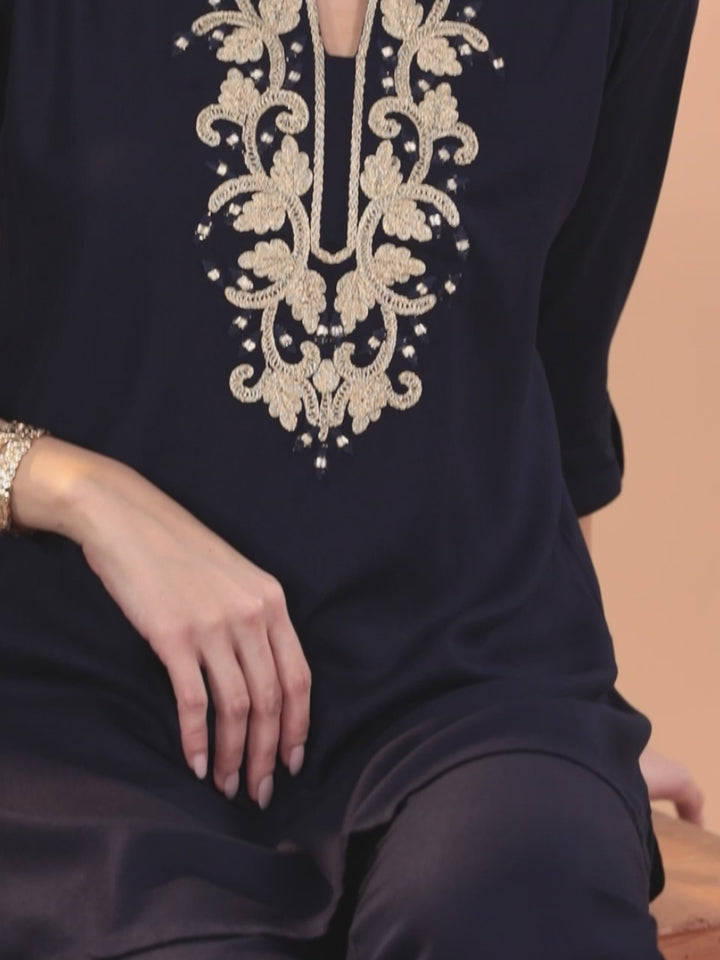 Our 2-piece navy blue Pashmina co-ord set features a straight-fit floral embroidered short kurta with a mandarin notched neckline, three-quarter sleeves, and a statement yoke. Complemented with trousers with a partially elasticated waistband and roomy pockets. Adorned with intricate embroidery and mirror work, this elegant style is perfect for casual outings.