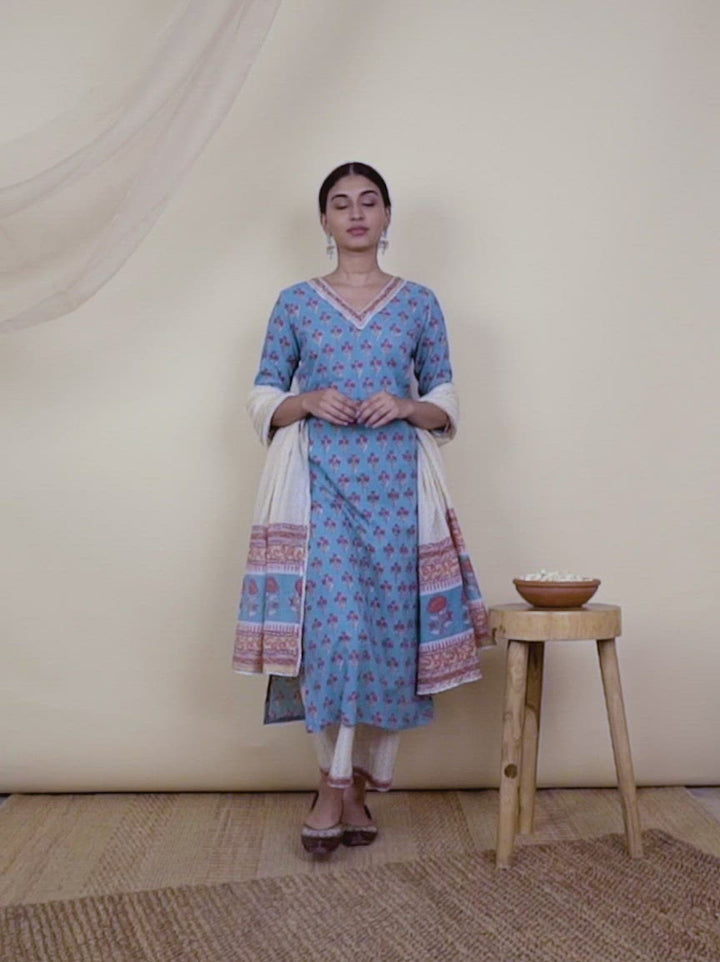 Blue Printed Cotton Straight Kurta With Palazzos & Dupatta