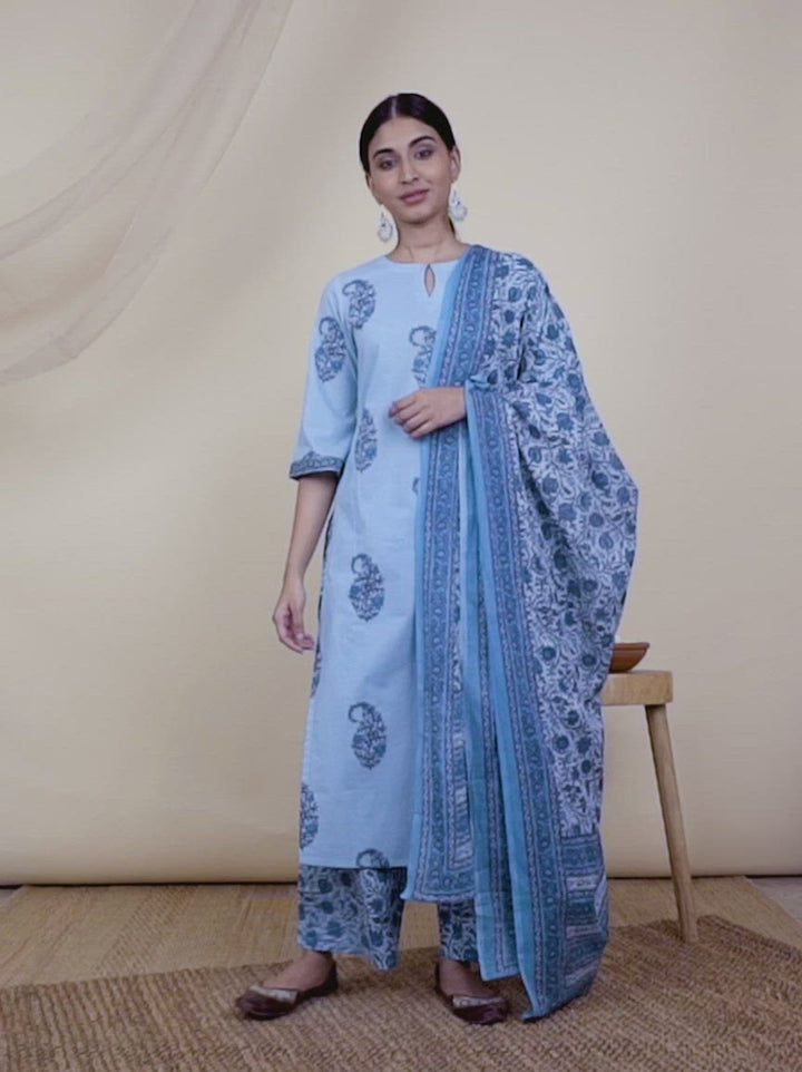 Turquoise Blue Printed Cotton Straight Kurta With Palazzos & Dupatta