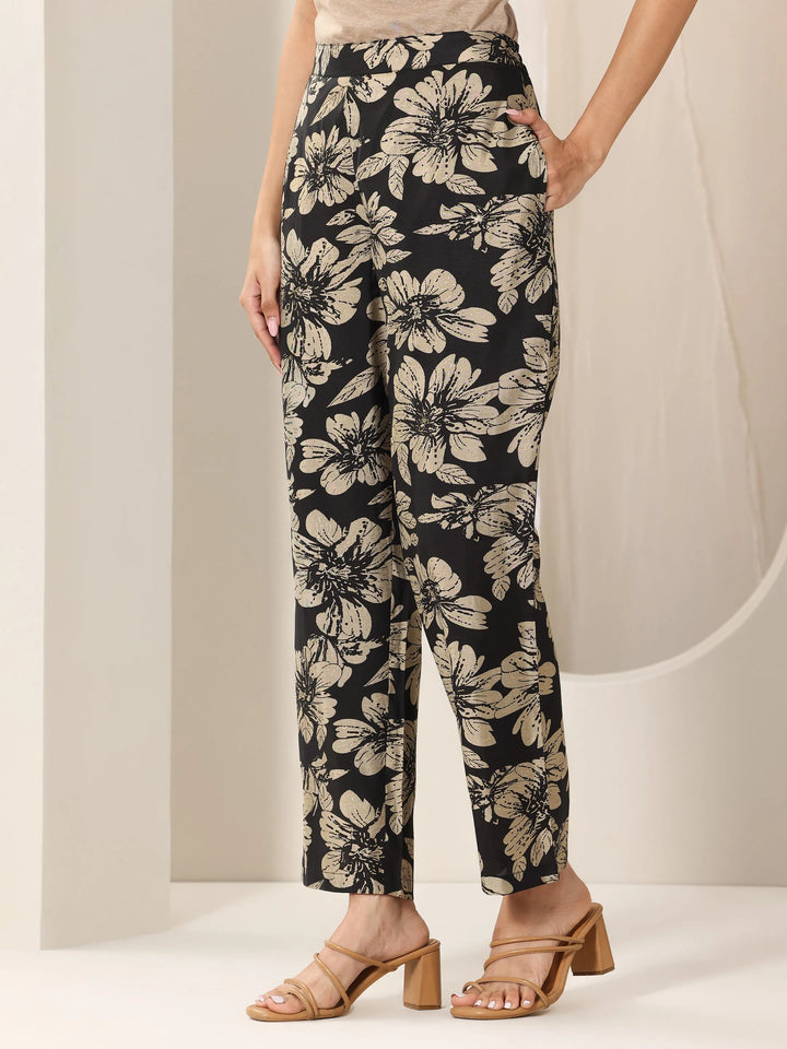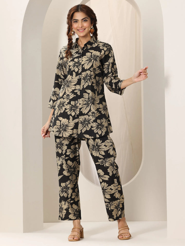Our 2-piece black printed rayon co-ord set features a buttoned-down kurta with a shirtcollar and three-quarter sleeves. Complemented with matching straight pants with a partially elasticated waistband and roomy pockets. Highlighted with floral prints, and stylish buttons, this style is perfect for casual outings.