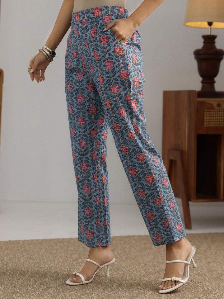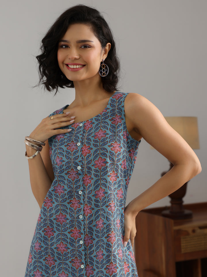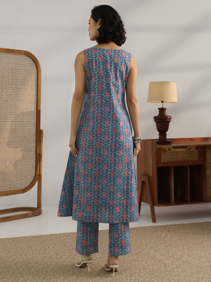 Blue Printed Cotton Straight Kurta Set