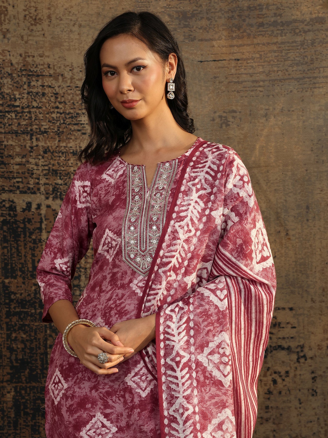 Our 3-piece maroon cotton blend straight-fit kurta set features a round neckline, regular sleeves, and statement yoke. Complemented with straight pants with a partially elasticated waistband and 2 pockets, and a printed dupatta. Adorned with ethnic motif printed, this style is perfect for dark festive occasions.