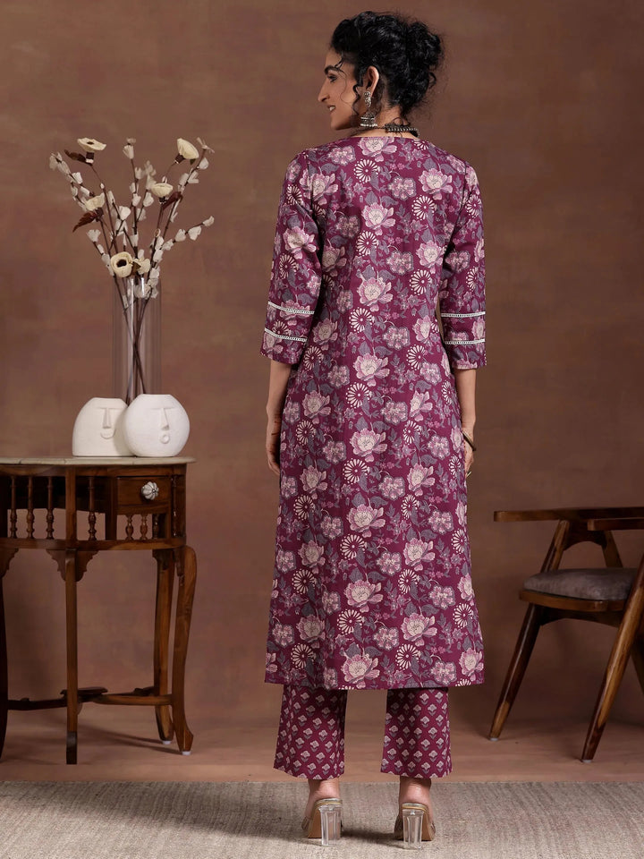 Our 2-piece burgundy printed cotton kurta set features a straight-fit kurta with a notched neckline and three-quarter sleeves. Complemented with trousers with a partially elasticated waistband and roomy pockets. Highlighted with lace detailing and cutwork, this style is perfect for casual outings.