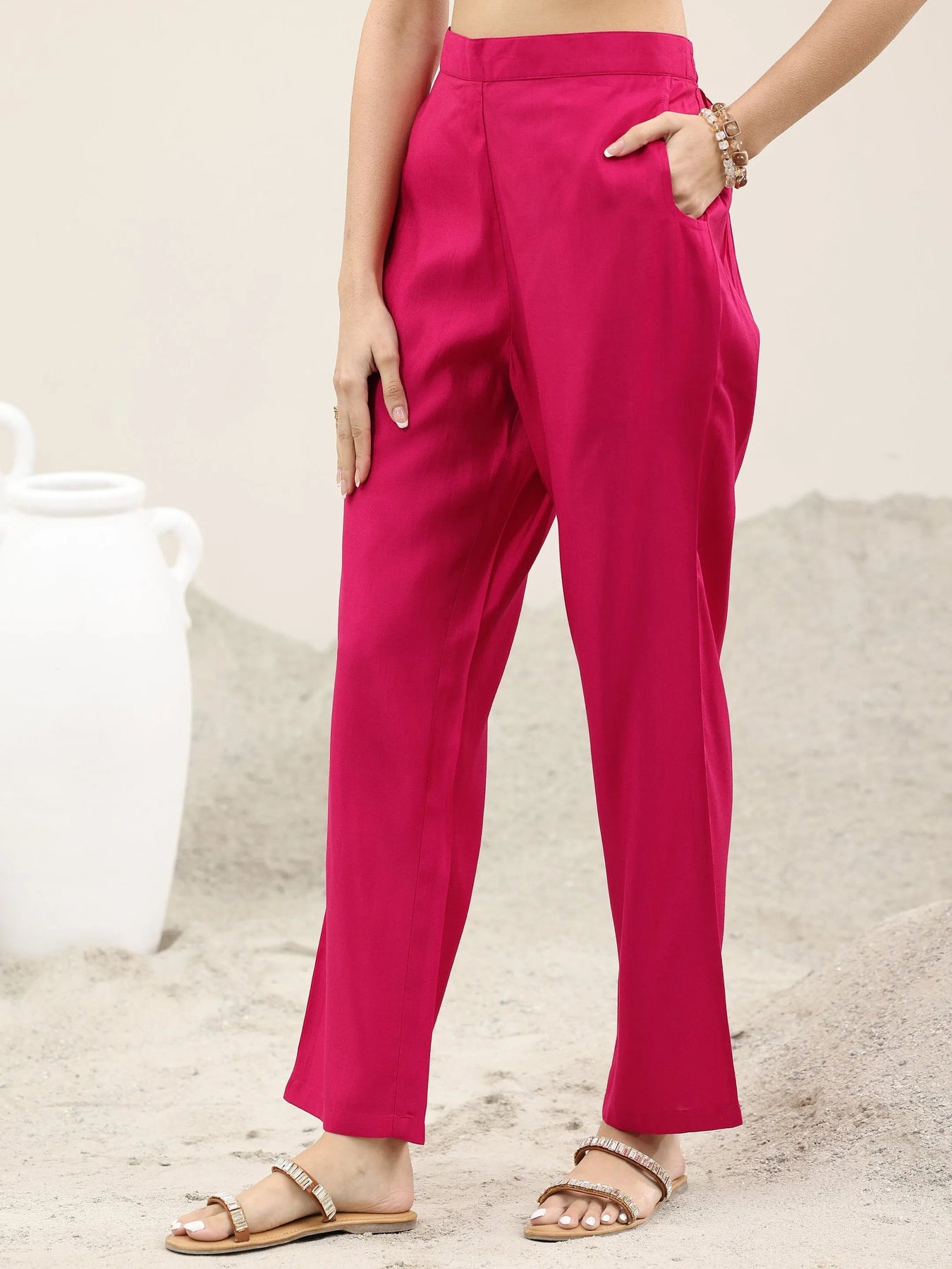 Our 3-piece pink printed silk blend straight suit set features a straight-fit kurta with a V-neckline, three-quarter sleeves and a statement yoke. Complemented with straight pants with a partially elasticated waistband, roomy pockets, and a dupatta. Highlighted with Bandhani-inspired prints, fabric-trim accents, and stylish beads, this style is perfect for elevated everyday wear.