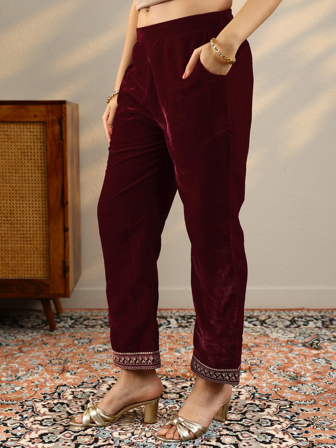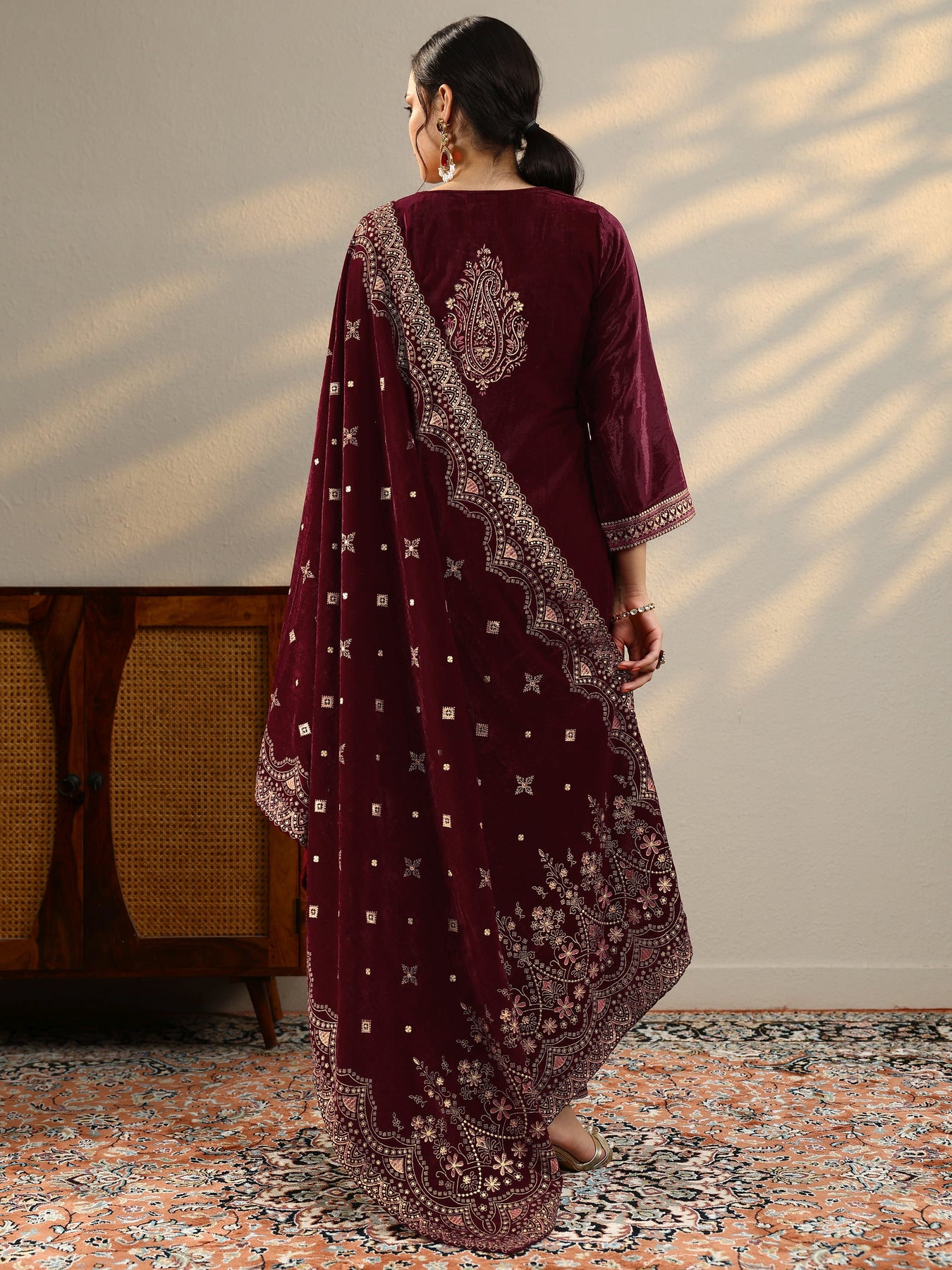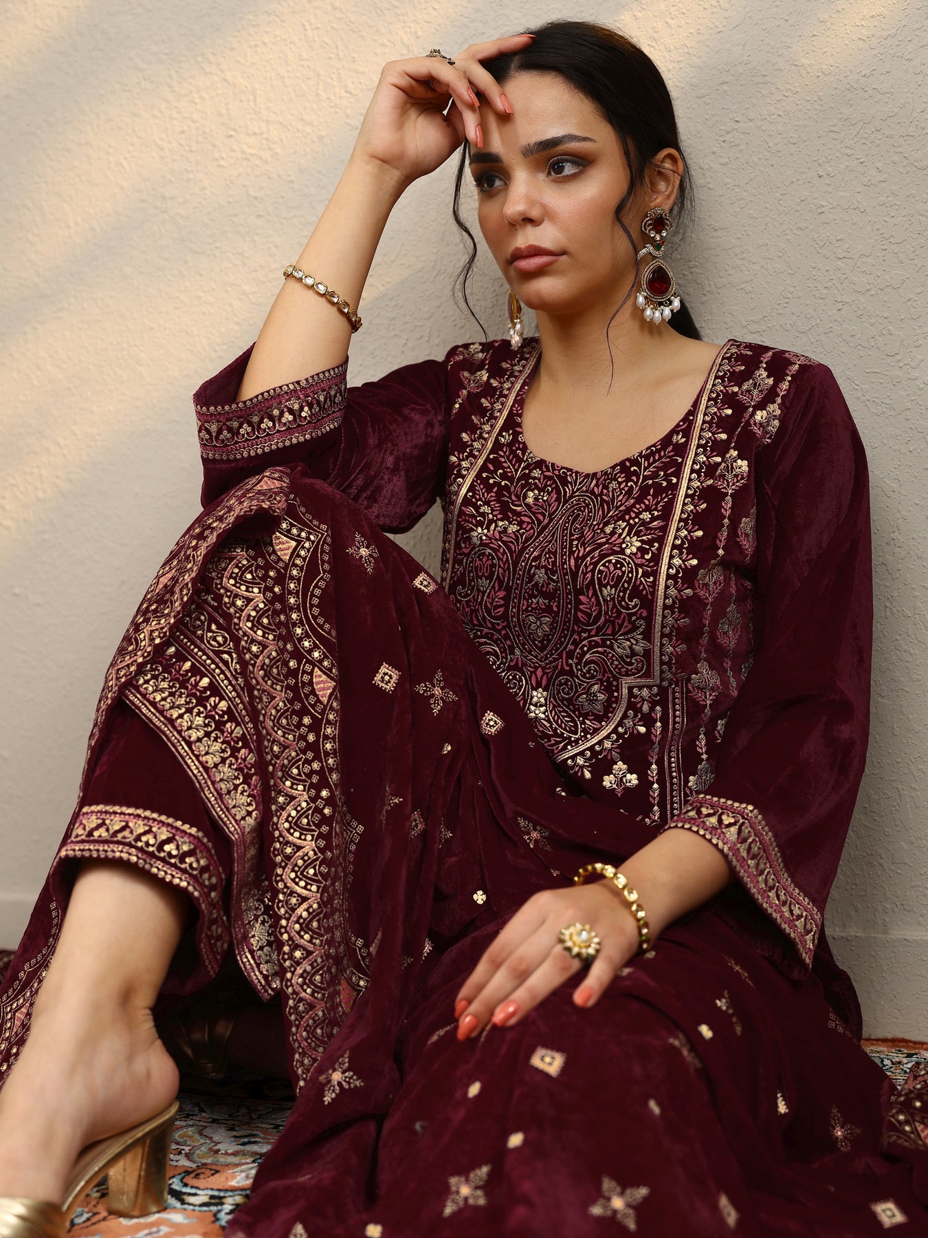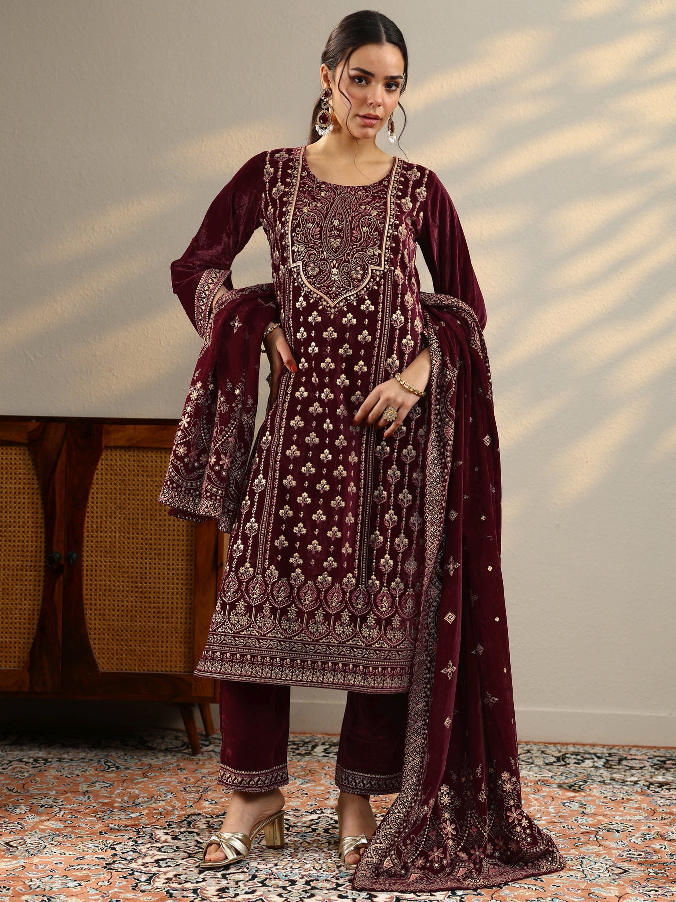 Our 3-piece maroon velvet suit set features a straight-fit kurta with a square neckline, regular sleeves, and a statement yoke. Complemented with straight pants with an elasticated waistband and an embroidered dupatta. Adorned with embroidered embellishments, this style is perfect for winters.