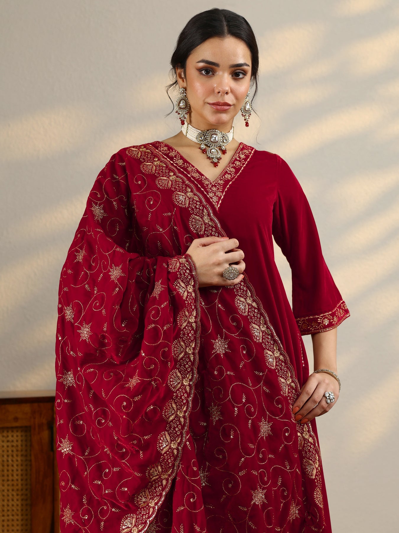 Red Yoke Design Velvet A-Line Kurta With Trousers & Dupatta