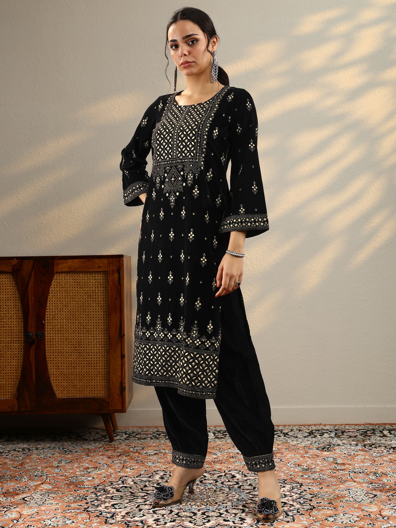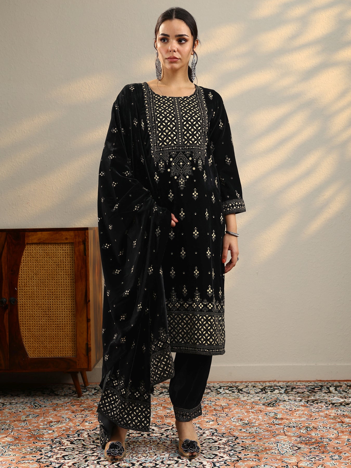 Our 3-piece black embroidered velvet suit set features a straight-fit kurta with a round neckline, three-quarter flared sleeves, and a statement yoke. Complemented with Salwar trousers with a partially elasticated waistband and roomy pockets, and a dupatta. Adorned with intricate thread work and sequins, this style is perfect for festive celebrations.