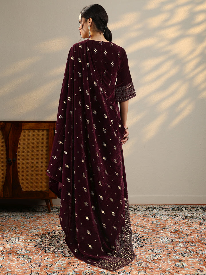 Burgundy Embroidered Velvet Straight Suit With Dupatta