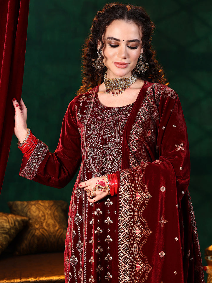 Our 3-piece maroon velvet suit set features a straight-fit kurta with a square neckline, regular sleeves, and a statement yoke. Complemented with straight pants with an elasticated waistband and an embroidered dupatta. Adorned with embroidered embellishments, this style is perfect for winters.