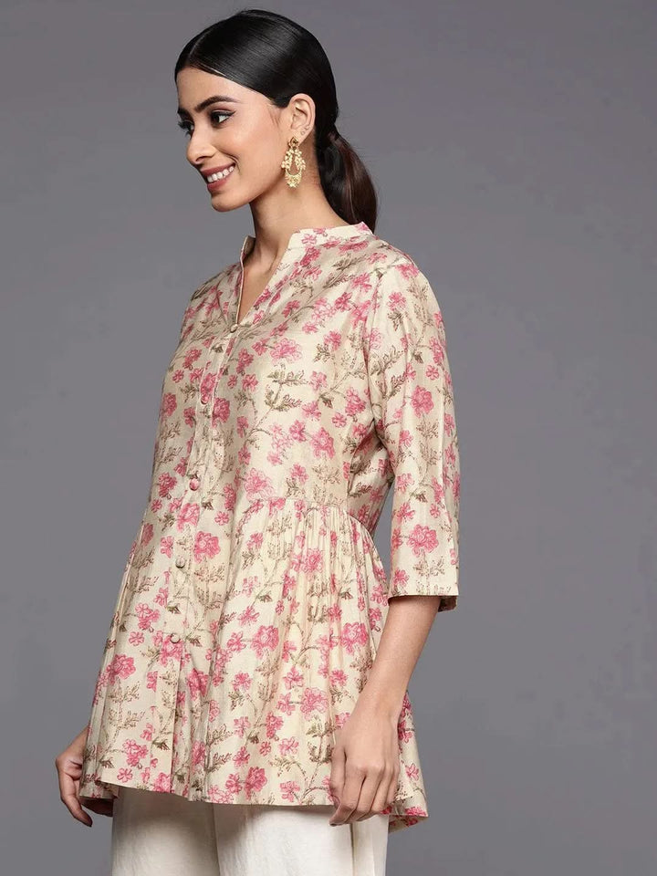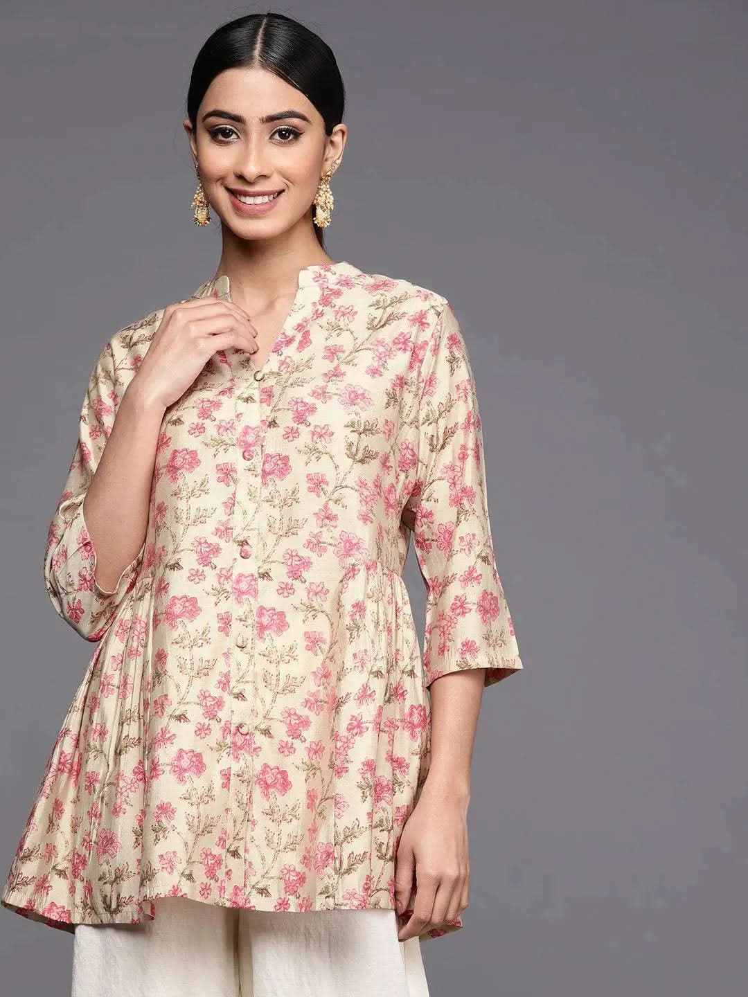 Our beige floral print short kurti, crafted in sumptuous silk blend fabric features a mandarin notched neckline, three-quarter sleeves, and a flared hemline. Adorned with handmade fabric buttons, this graceful style is ideal for casual outings.
