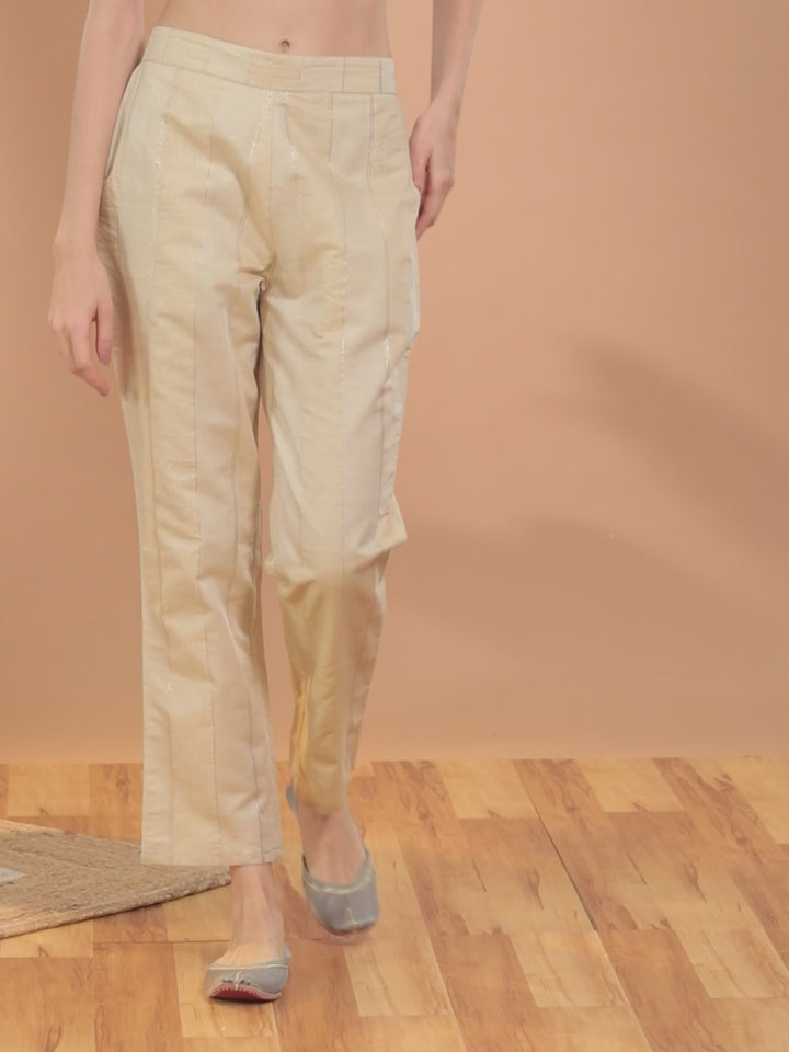Our beige woven trousers feature a partially elasticated waistband, flat-front with no pleats design, and mid-rise waist style with slip-on closure and roomy pockets. This intricate style is perfect for festive celebrations.