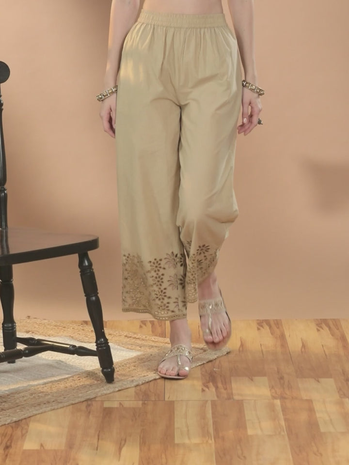 Our beige woven palazzos, made of cotton fabric, feature a partially elasticated waistband, and roomy pockets. Adorned with schiffli detailing, this refreshing style is perfect for casual outings.