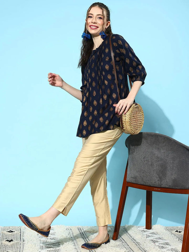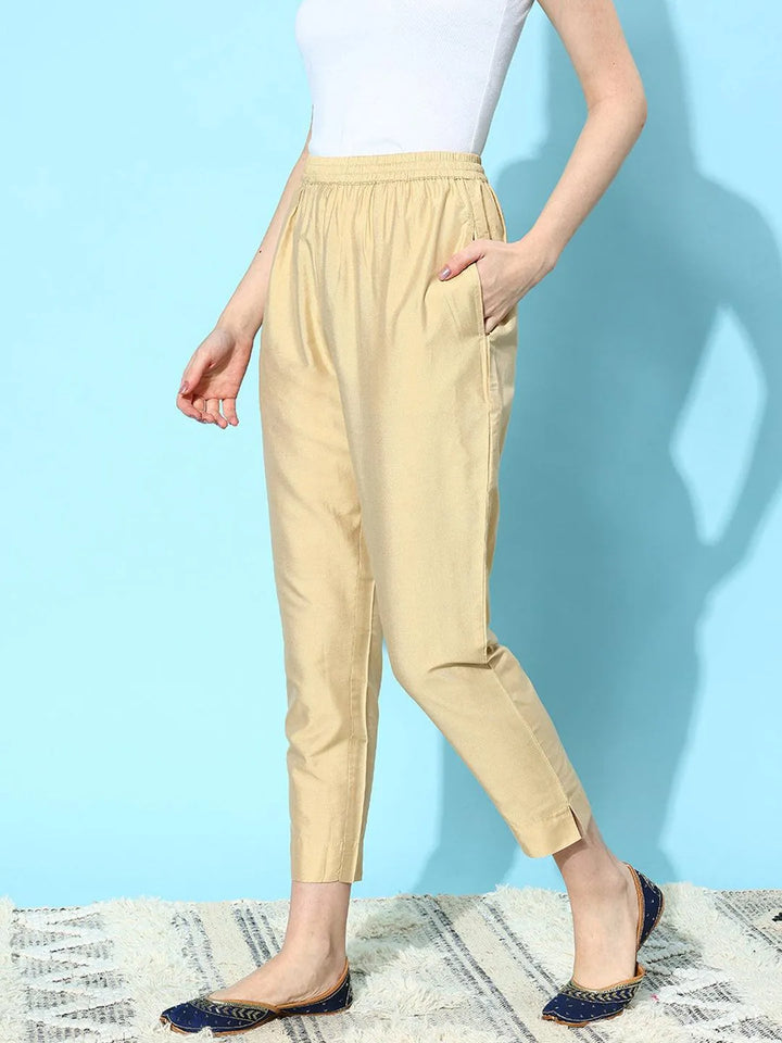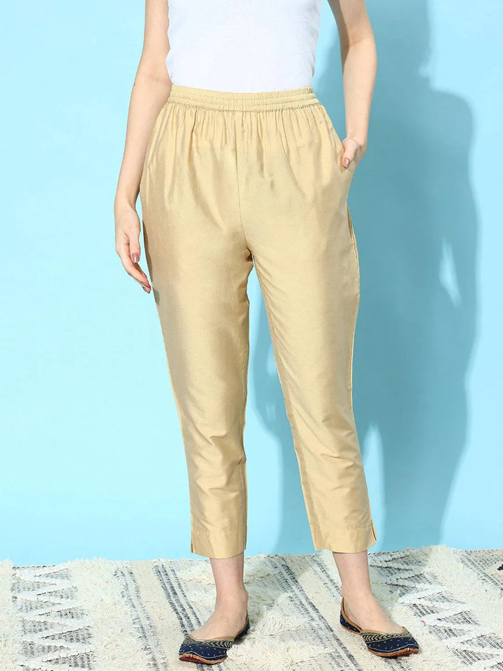 Our beige silk trousers feature a partially elasticated waistband, flat-front with pleats design, and mid-rise waist style with slip-on closure and roomy pockets. Adorned with an elegant hem design, this intricate style is perfect for festive celebrations.