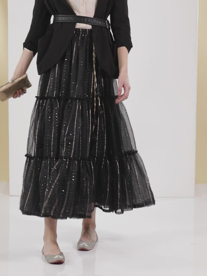 Our black midi skirt features a partially elasticated waistband, drawstring and pleated details. Adorned in an embellished pattern and flared hemline, this intricate style is perfect for festivities.