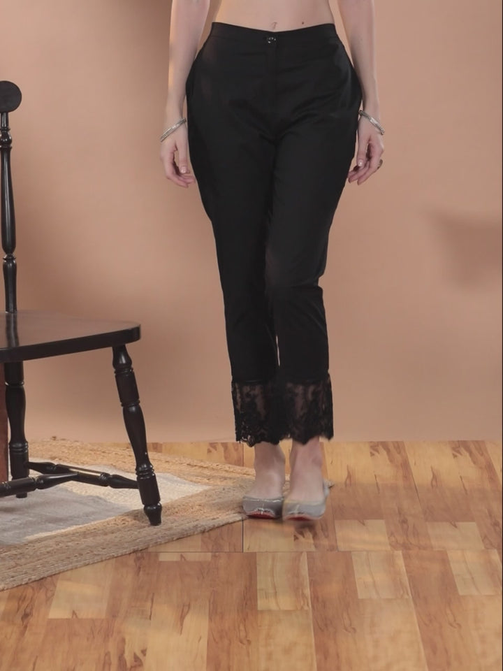 Our black cotton woven trousers feature a partially elasticated waistband, flat-front with no pleats design, and mid-rise waist style with roomy pockets. Adorned with an elegant hem design and fine lace accents, this intricate style is perfect for parties.