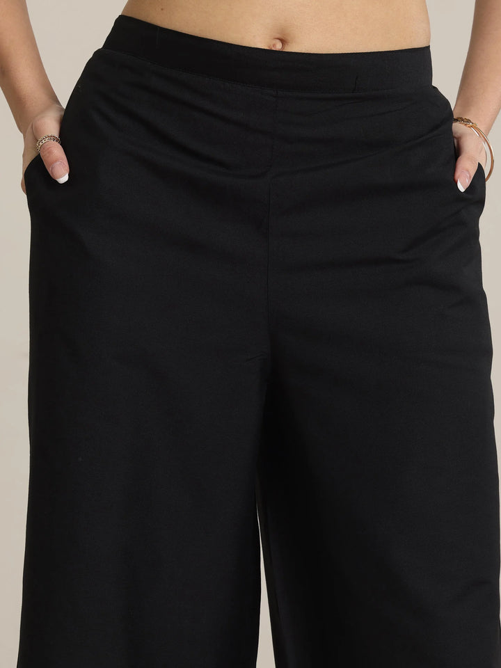 Our black solid silk trousers feature a partially elasticated waistband and roomy pockets. Crafted with attention to detail, this style is perfect for casual outings.