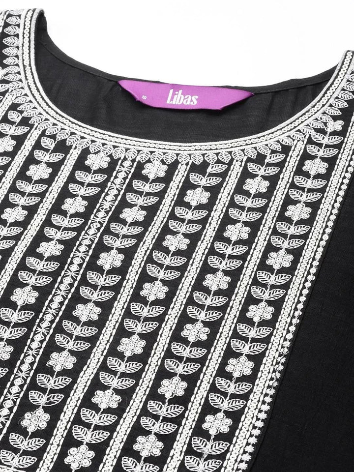 Our black solid tone straight-fit silk kurta features a round neckline, three-quarter sleeves, and a statement yoke. Elevated with intricate embroidery, this graceful style is perfect for casual outings.