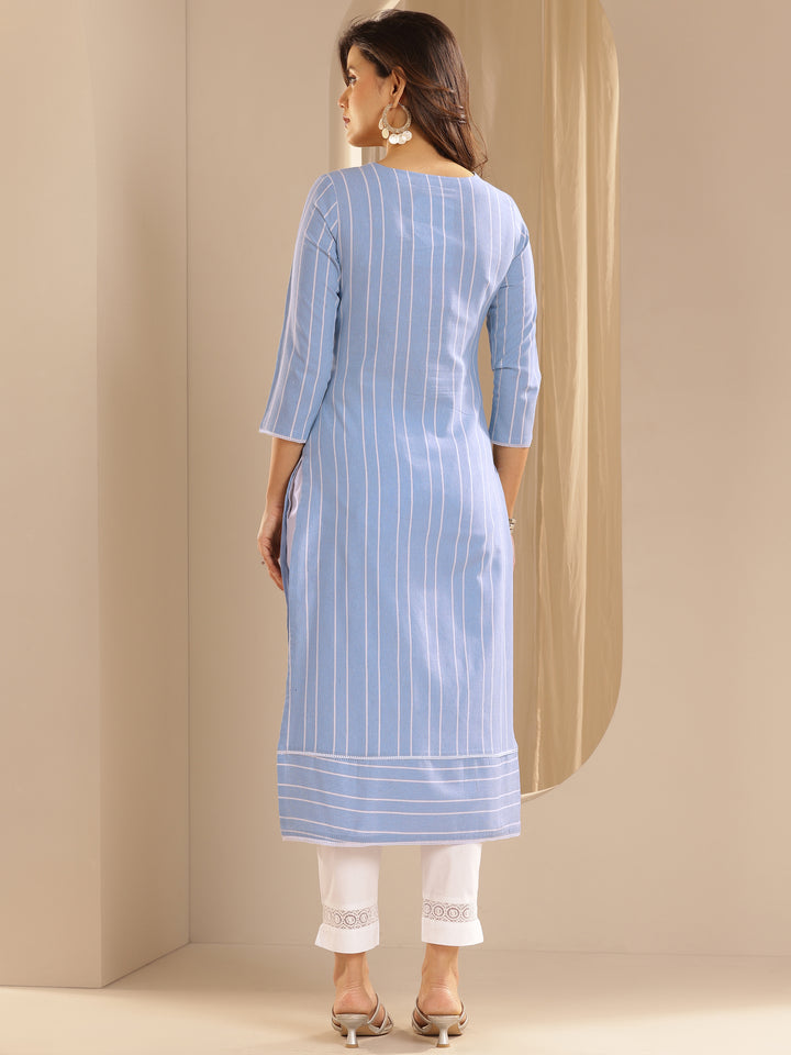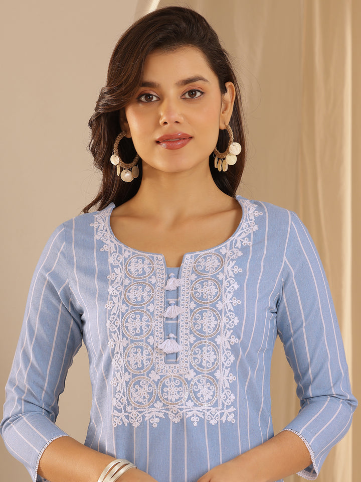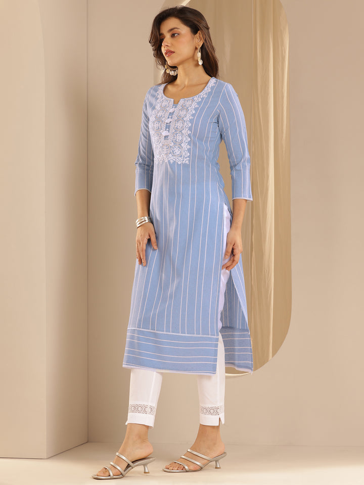 Our 1-piece blue cotton blend straight-fit kurta features a round neckline, regular sleeves and statement Yoke. Adorned with floral embroidered, this style is perfect for casual wear.