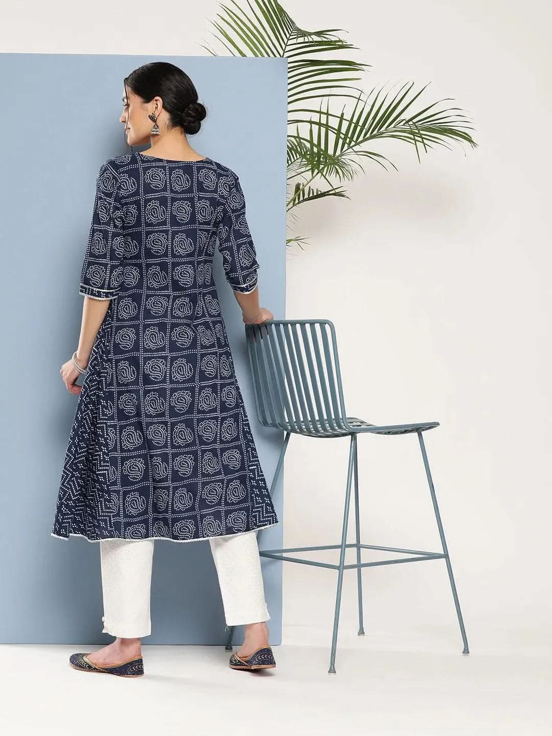 Our blue A-line Bandhani inspired print cotton kurta features a round neckline, three-quarter sleeves, and roomy pockets. Adorned with delicate Gota Patti accents, this charming style is ideal for work and beyond.