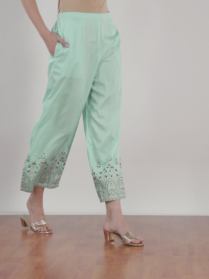 Our blue silk straight palazzo pants feature a partially elasticated waistband and roomy pockets. Adorned with an ethnic motif print and delicate gilded accents, this refreshing style is perfect for light festivities.