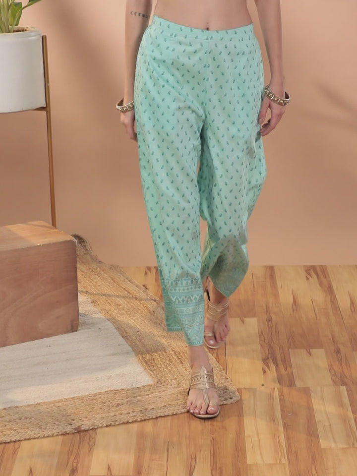 Our blue silk blend straight palazzo pants feature a partially elasticated waistband and roomy pockets. Adorned with an ethnic motif print and delicate gilded accents, this refreshing style is perfect for light festivities.