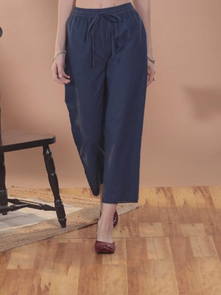 Our navy blue chic palazzo pants, made of cotton fabric, feature a partially elasticated waist with a drawstring and 2 roomy pockets. Adorned with an ethnic motif design, this refreshing style is perfect for festivities.