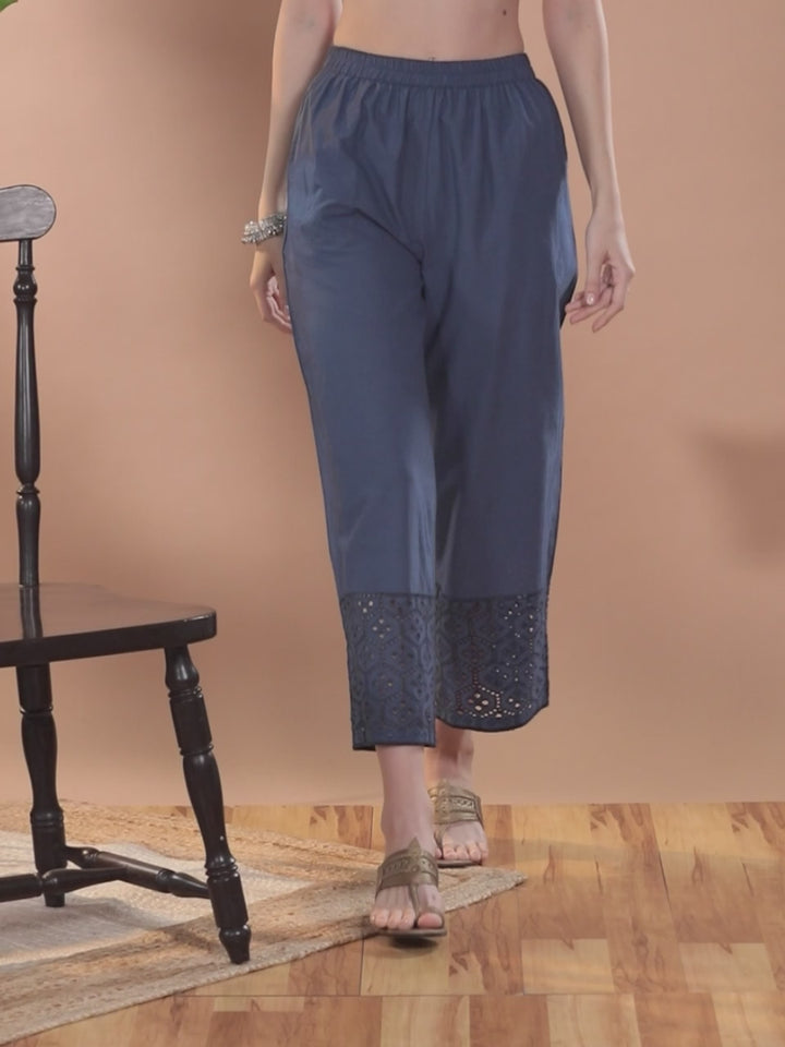 Our blue woven palazzos, made of cotton fabric, feature a partially elasticated waistband, and roomy pockets. Adorned with schiffli detailing, this style is perfect for work and beyond.