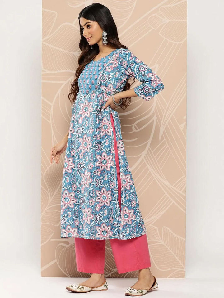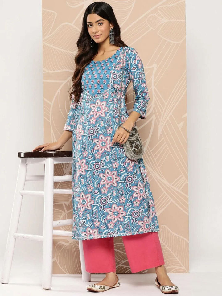 Our blue floral print straight-fit cotton kurta features a round neckline, three-quarter sleeves, stylish high-slit detailing, and a statement yoke. Adorned with handcrafted dori details and delicate Gota Patti accents, this comfortable style is ideal for casual outings.