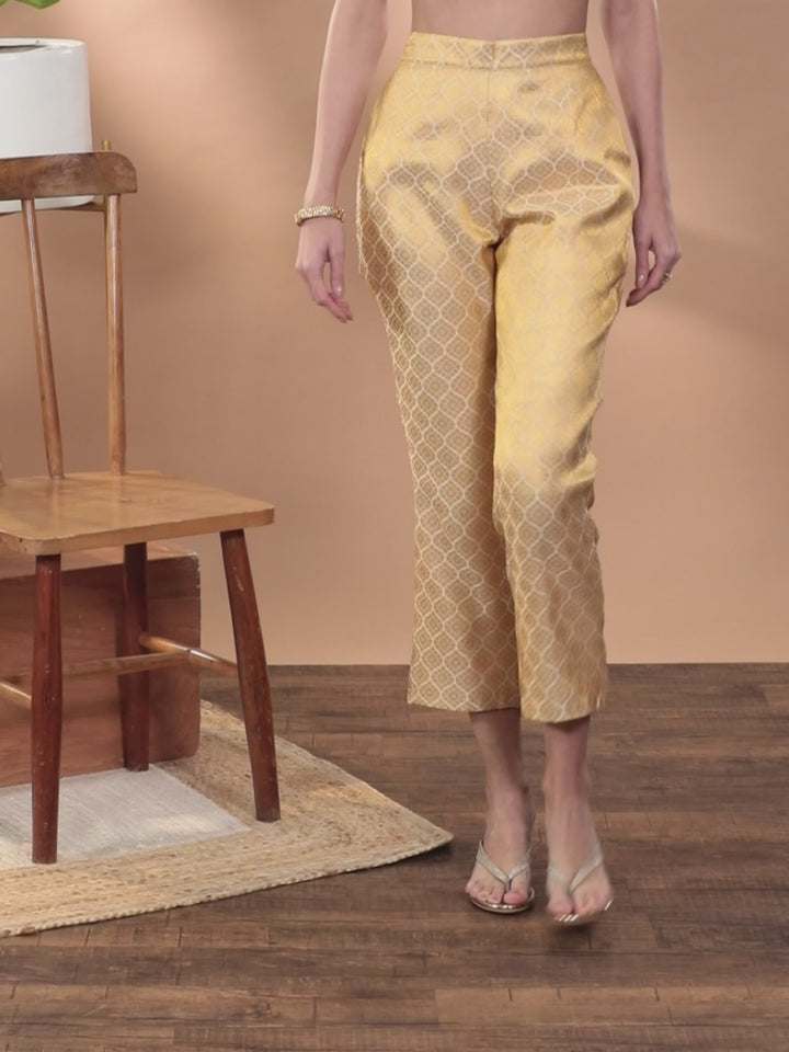 Our gold woven metallic trousers, highlighted with ethnic motifs print on jacquard fabric, feature a partially elasticated waistband, 2 roomy pockets and a regular fit mid-rise waist style. This elegant style is ideal for light festivities.