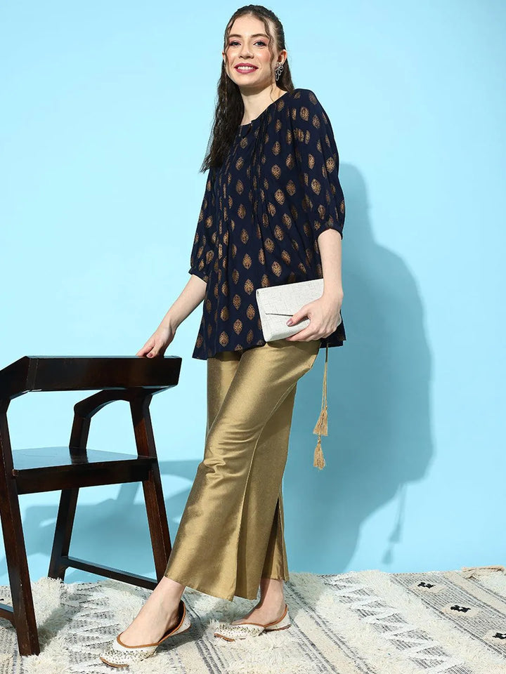 Our gold-toned woven chic palazzo pants, made of silk fabric, feature a partially elasticated waist with a slip-on closure and 2 roomy pockets. Adorned with an elegant hem, this refreshing style is perfect for festivities.