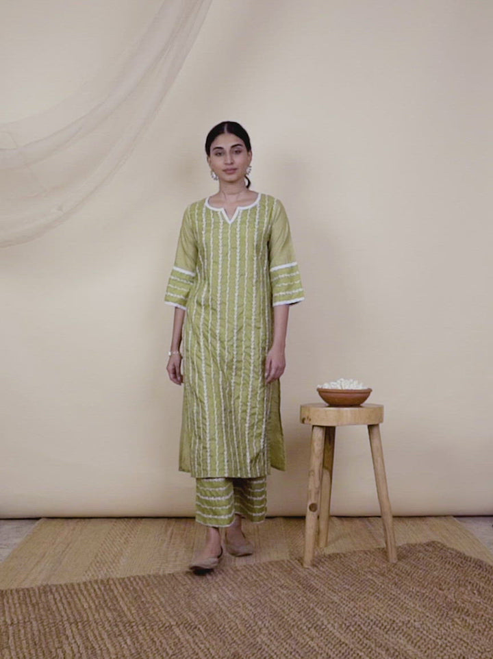 Decorated with delicate Schiffli embroidery, our green straight cut kurta features floral embroidered motifs and intricate lace detailing on the neckline and sleeves.