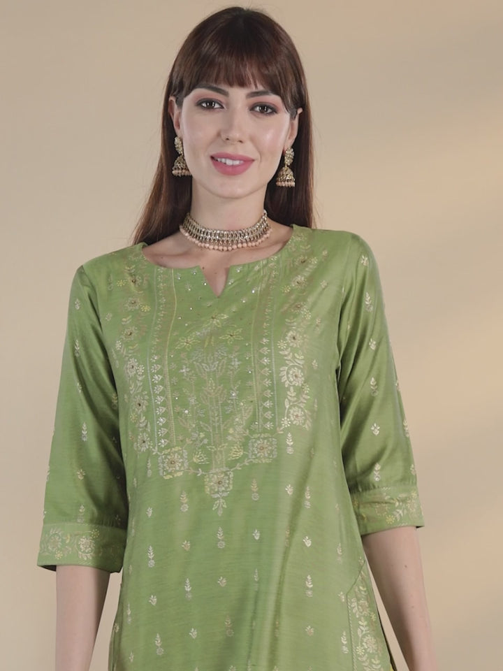 Our pink Chanderi silk straight-fit kurta features a straight shape with a notched neckline, and three-quarter regular sleeves. Adorned with Gota Patti and embellished details, this graceful style is perfect for daytime festivities.