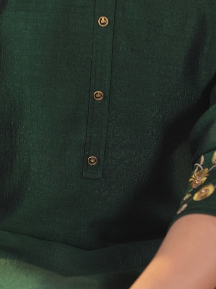 Our green straight-fit kurta, crafted in soft silk fabric, features a round neckline and three-quarter sleeves. Adorned with threadwork accents, this comfortable style is ideal for work and beyond.
