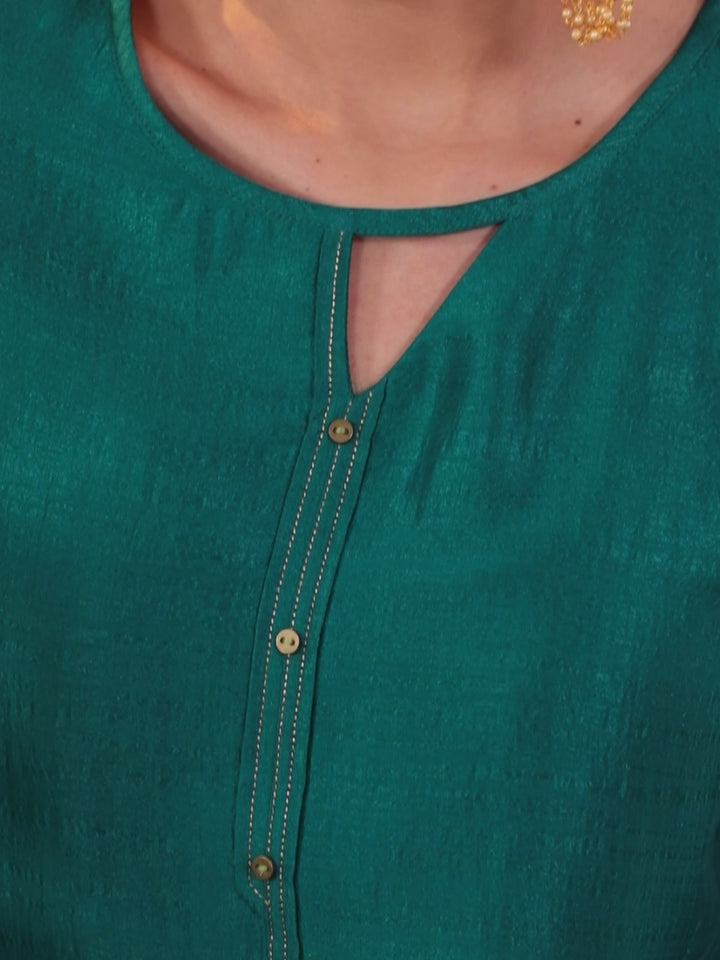Our teal straight-fit kurta, crafted in soft silk fabric, features a round neckline and three-quarter sleeves. Adorned with threadwork accents, this comfortable style is ideal for festive celebrations.