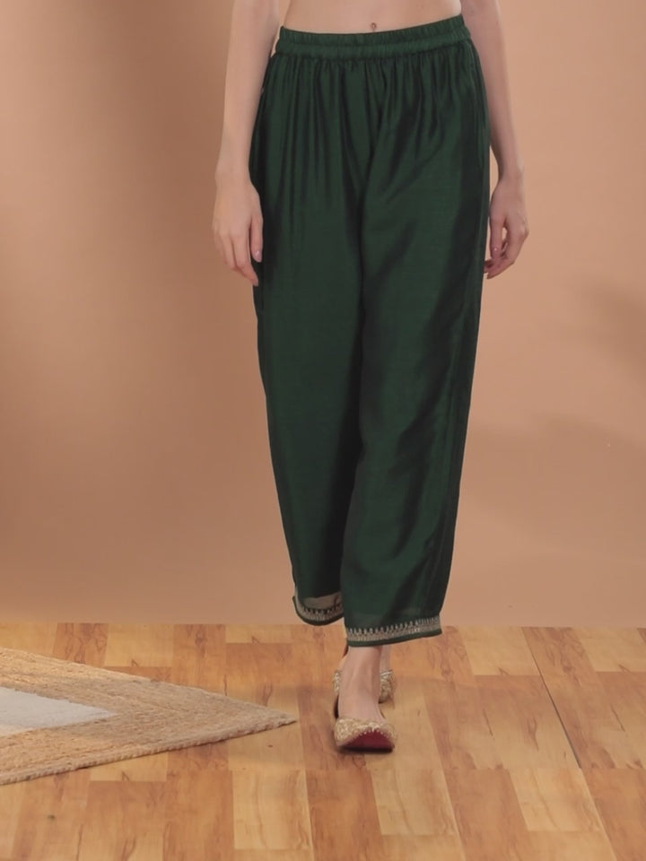 Our green woven chic palazzo pants, made of silk fabric, feature a partially elasticated waist with a slip-on closure and flared fit. Adorned with an elegant hem and fine embroidered edges, this refreshing style is perfect for festivities.