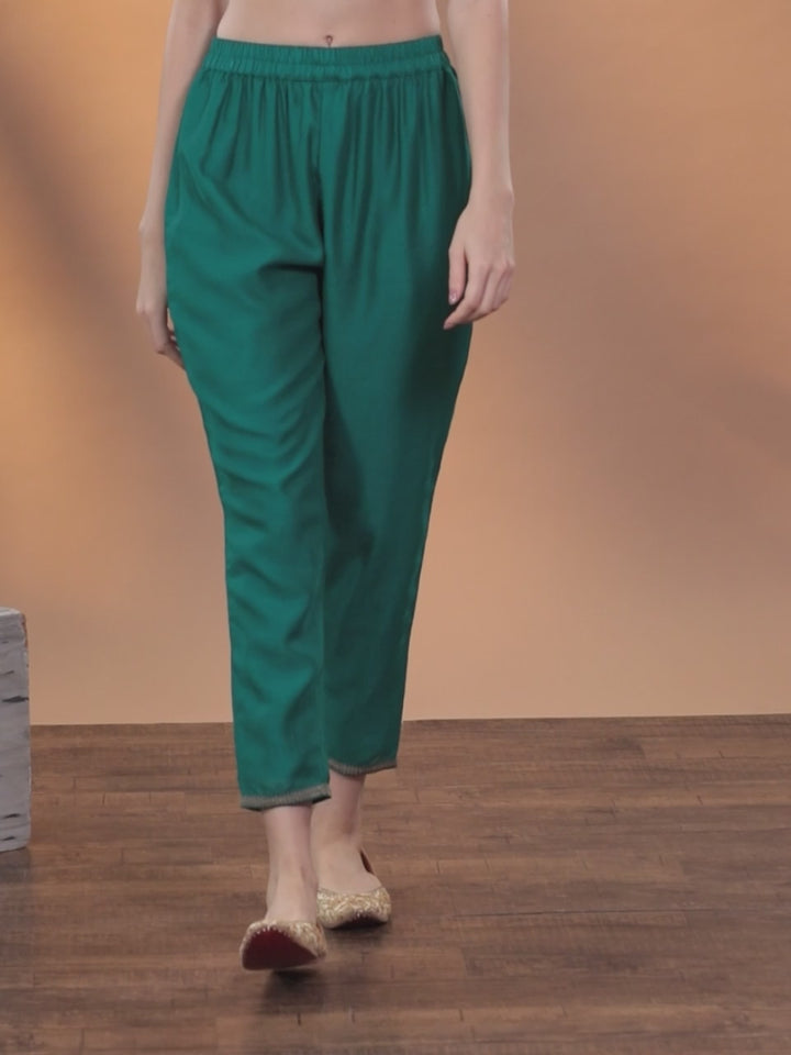 Our green woven trousers feature a partially elasticated waistband, flat-front with no pleats design, and mid-rise waist style with slip-on closure and roomy pockets. Adorned with an elegant hem design and fine embroidered lace edges, this intricate style is perfect for festive celebrations.