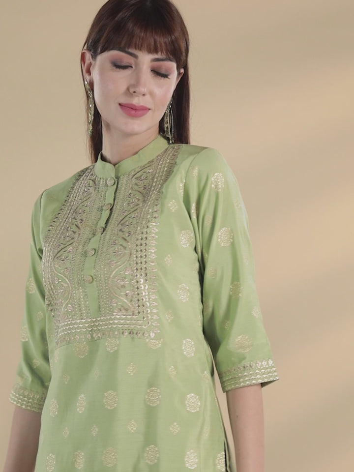 Our green straight-fit Chanderi silk kurta features a mandarin collar, and three-quarter sleeves. Adorned with fabric buttons, this refreshing style is perfect for festive celebrations.