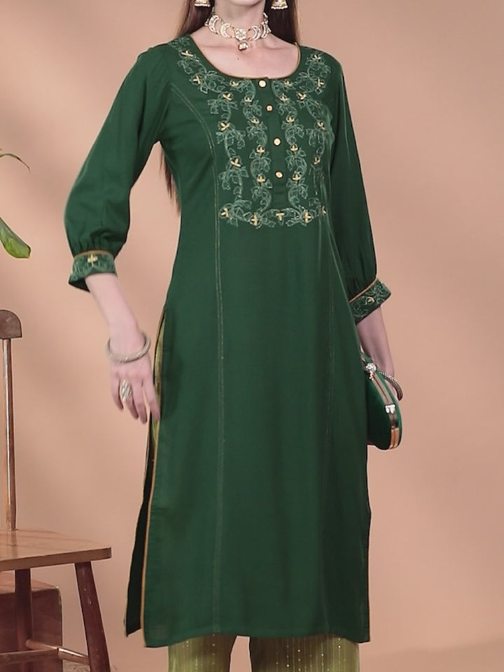 Our green solid tone rayon straight-fit kurta features a round neckline, three-quarter bishop sleeves, and a statement yoke. Elevated with stylish buttons and intricate embroidery, this graceful style is ideal for casual outings.