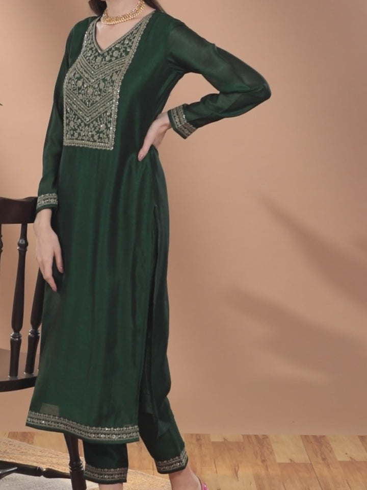 Our green and gold straight-fit kurta, crafted in soft silk fabric, features a V-neckline and regular long sleeves. Adorned with statement yoke and sequinned accents, this comfortable style is ideal for festive celebrations.