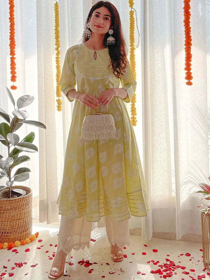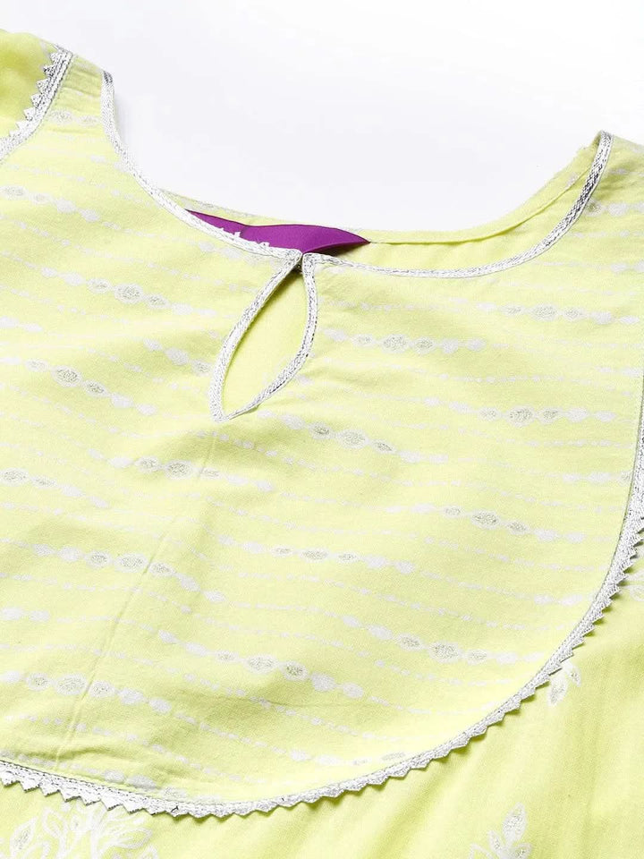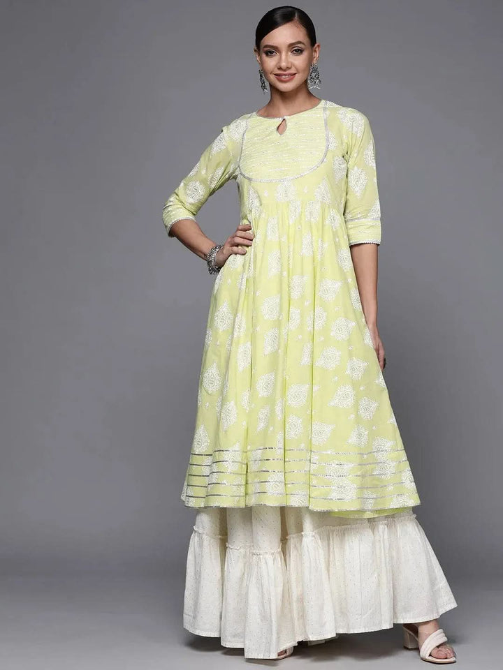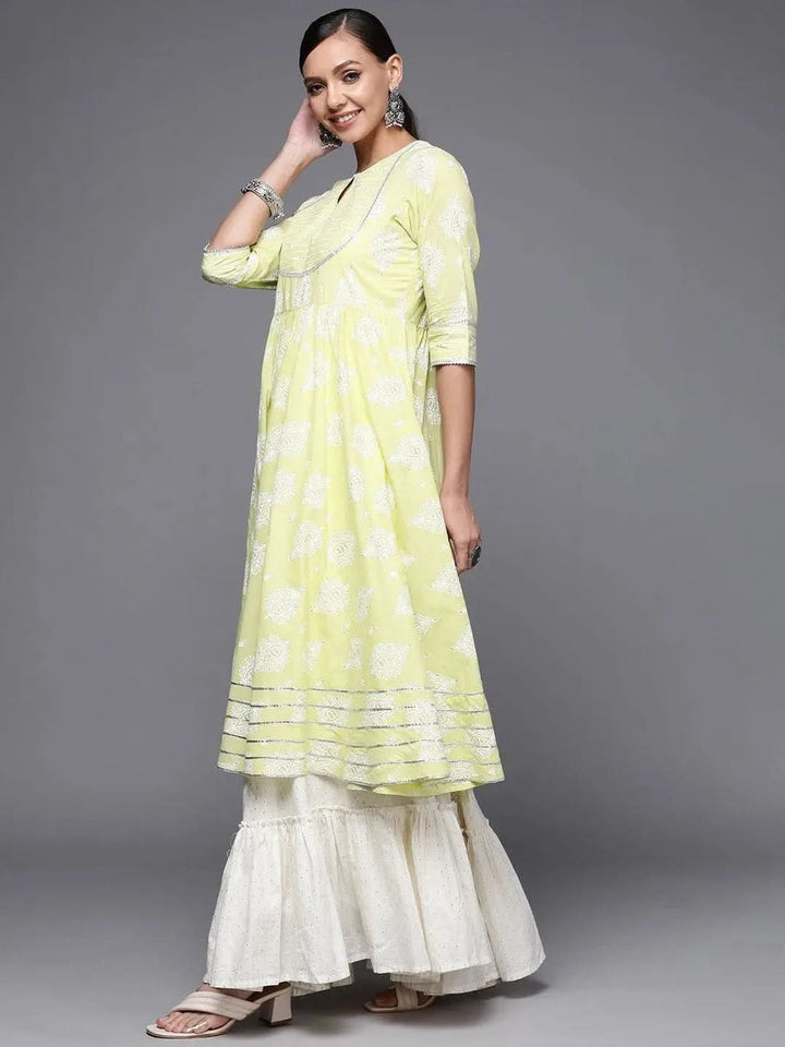 Our lime green floral print Anarkali cotton kurta features a keyhole neckline, three-quarter sleeves, a statement yoke, and a flared hemline. Adorned with delicate Gota Patti accents, the refreshing style is ideal for light festivities.